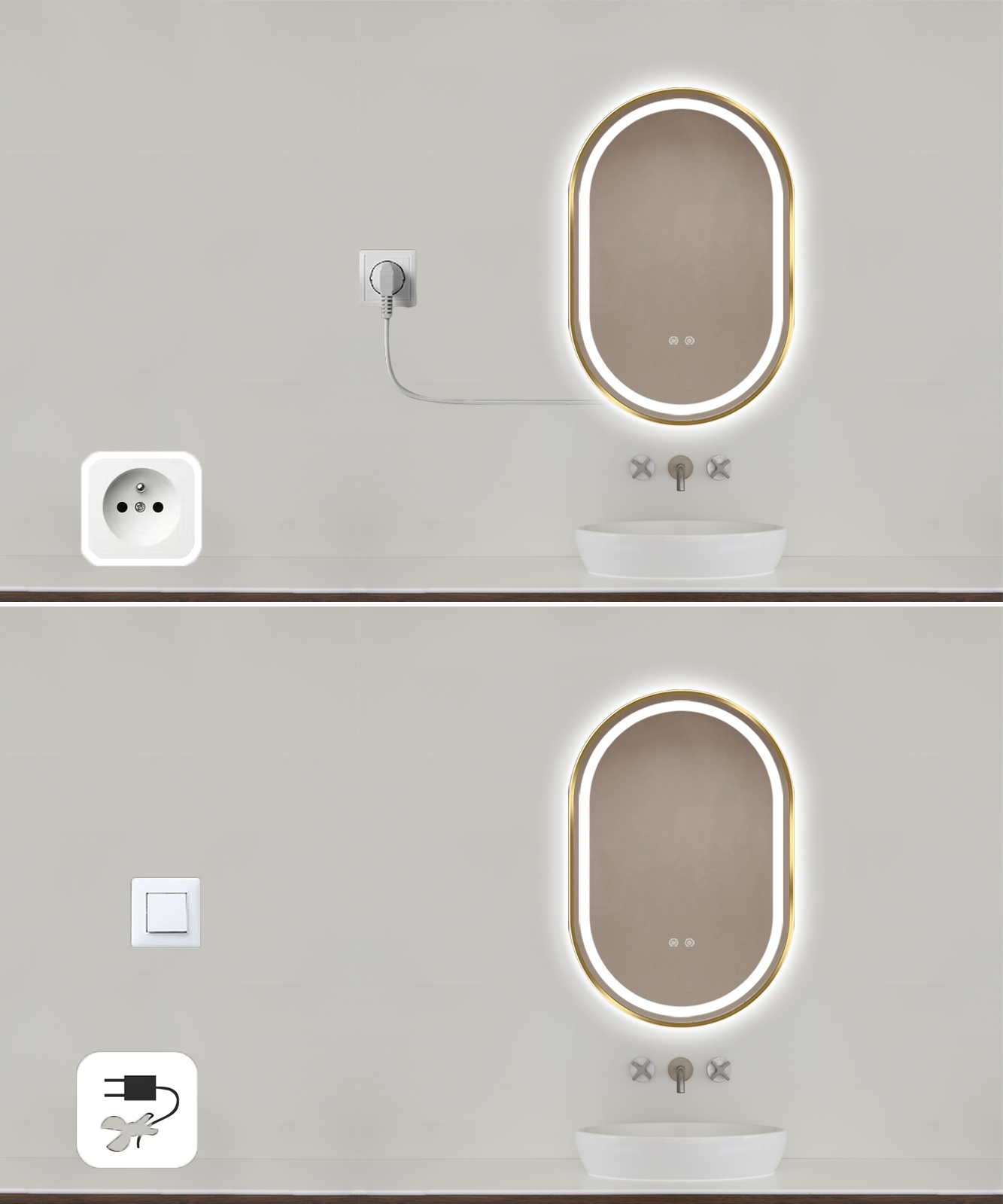 - Дзеркало без перемикача для використання зовнішнього вимикача, напр. настінний вимикач
