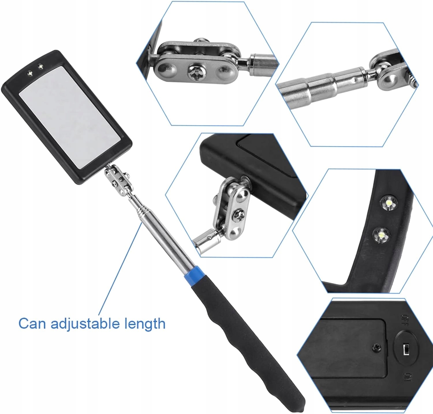 Виготовлений із легованої сталі та твердого АБС-пластику, довговічний і міцний, безпечний і екологічно чистий у використанні. Він також має кульовий шарнір, що обертається на 360 градусів, для додаткових можливостей огляду, що дозволяє оглядовому дзеркалу вільно обертатися, зберігаючи бажане положення. Він має 2 дуже яскраві світлодіоди, які полегшують огляд важкопомітних і важкодоступних місць в транспортних засобах, машинах тощо, легко заглядаючи в темні щілини на робочому місці. Зручна ручка з м’якою не- ковзаюча рукоятка ABS, розроблена для впевненого контролю. Довжину можна регулювати відповідно до ситуації. Ідеальний інструмент для виробників інструментів, механіків, інспекторів і механіків, освітлення робить його особливо корисним у темних і важкопомітних місцях.