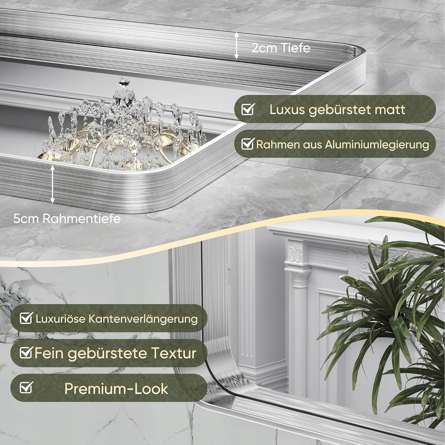 ВИСОКОЯКІСНА АЛЮМІНІЄВА РАМА Декоративне настінне дзеркало оснащено міцною алюмінієвою рамою, що забезпечує стабільність і довговічність.