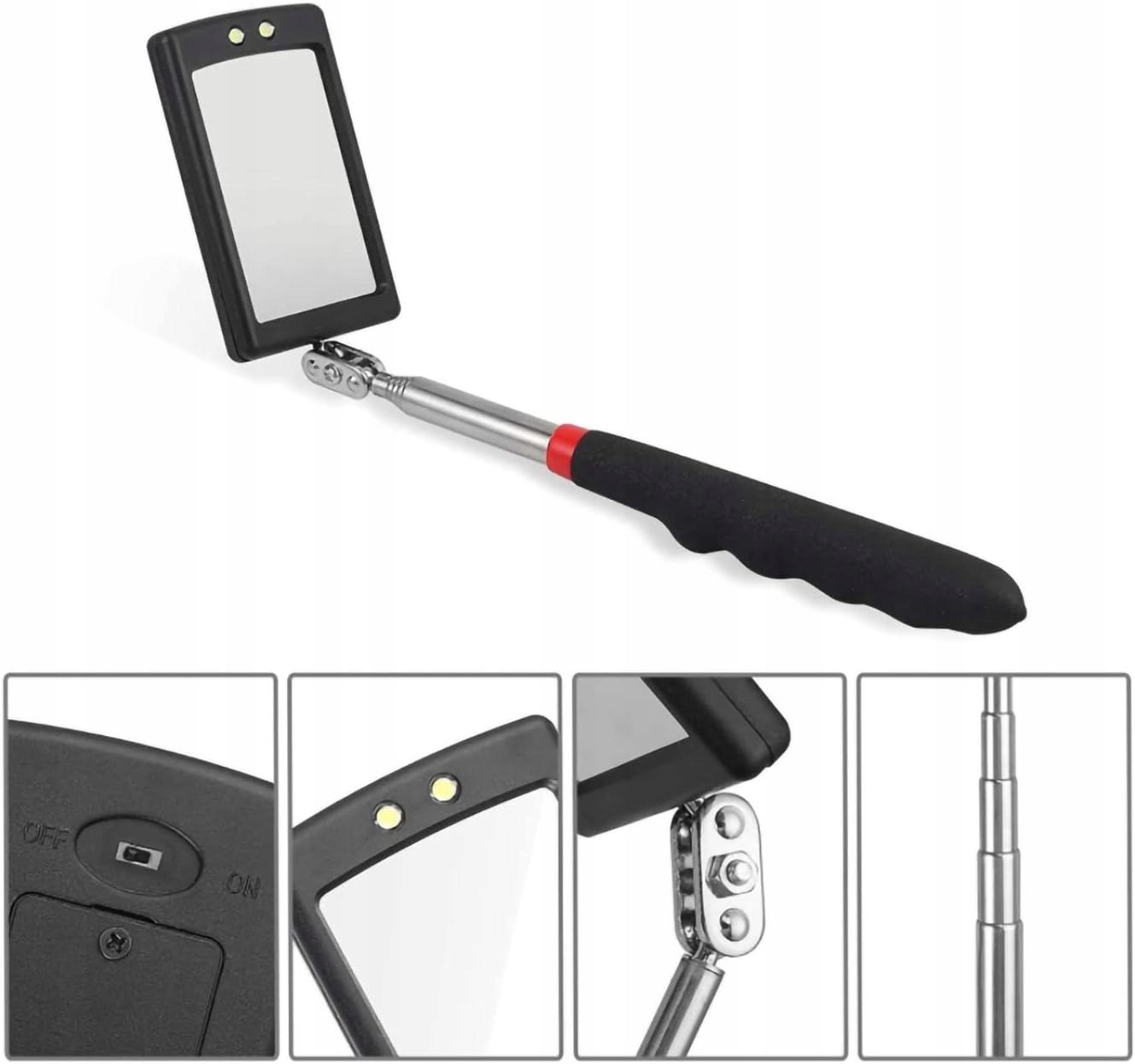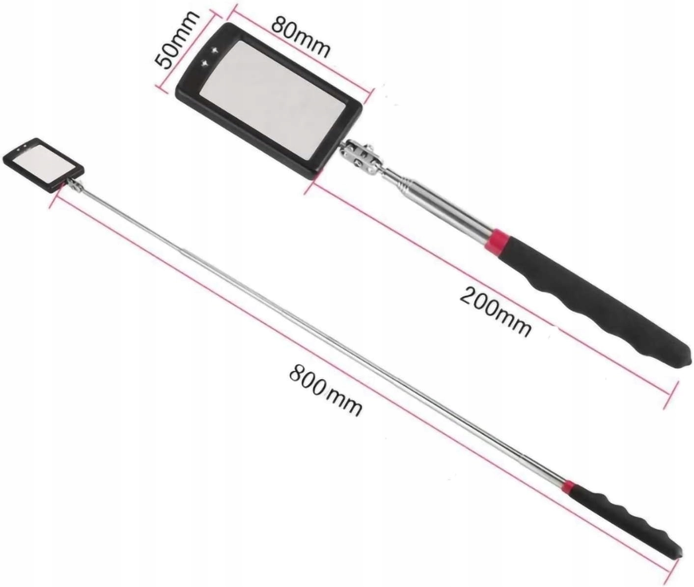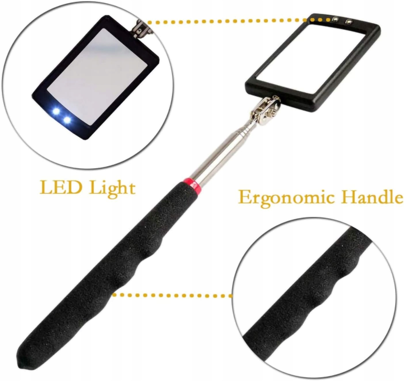 Має 2 світлодіоди Полегшує перевірку важкодоступних і важкодоступних місць Лампи роблять його особливо корисним у темних і важкодоступних місцях Поворот має подвійний кульовий шарнір на 360 градусів для додаткових можливостей перегляду М'який матеріал Зручна лита поліамідна ручка з м'якою нековзкою гумовою рукояткою Ідеальний вибір Оглядові дзеркала ідеально підходять для виробників інструментів, механіків інспекторів і машиністів Достатній діапазон Оглядові дзеркала є ідеальним інструментом для огляду днища автомобілів, машин, вантажівок, шкільних автобусів, поїздів, будівельного обладнання, промислового обладнання та інші важкодоступні ділянки