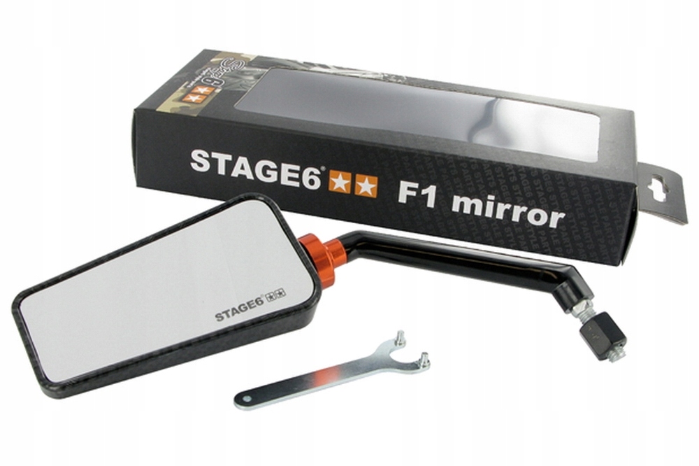 Дзеркало Stage6 Styling Parts F1 Style. Улюблені дзеркала F1 Style нарешті також доступні в Stage6. Привабливий дизайн і ідеальне виконання. Доступний у кількох цікавих кольорових версіях, кожен знайде щось для себе. Регульоване дзеркало. Хороша видимість. Завдяки спеціальному гвинту гарантується стійкість дзеркала навіть на високих швидкостях. Дзеркало постачається зі спеціальним ключем для гвинта, який кріпить дзеркало до кронштейна, і адаптером M8.