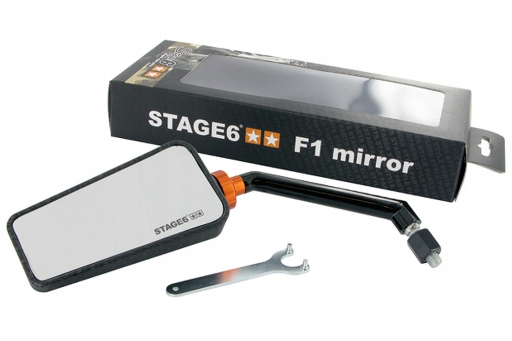 Дзеркало Stage6 Styling Parts F1 Style. Улюблені дзеркала F1 Style нарешті також доступні в Stage6. Привабливий дизайн і ідеальне виконання. Доступний у кількох цікавих кольорових версіях, кожен знайде щось для себе. Регульоване дзеркало. Хороша видимість. Завдяки спеціальному гвинту гарантується стійкість дзеркала навіть на високих швидкостях. Дзеркало постачається зі спеціальним ключем для гвинта кріплення дзеркала до кронштейна та адаптером M8.