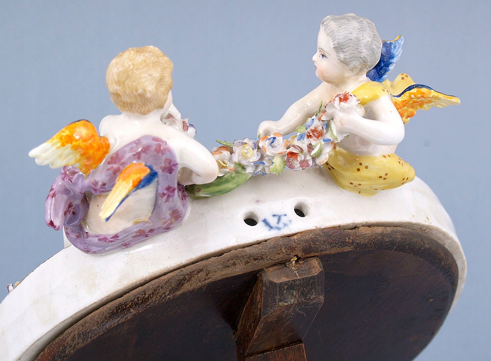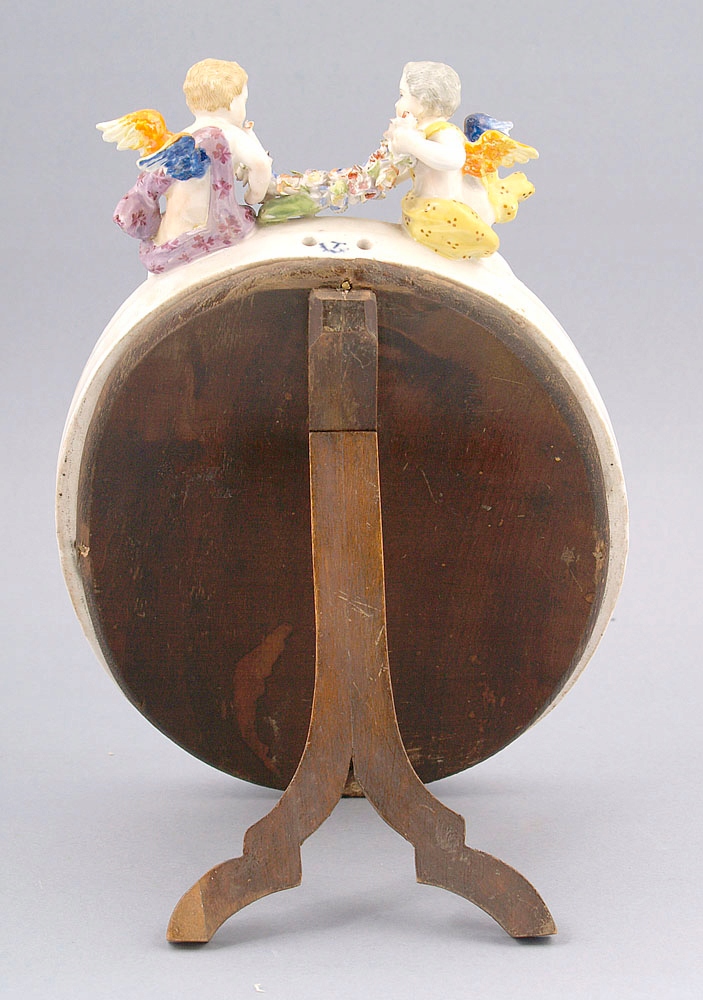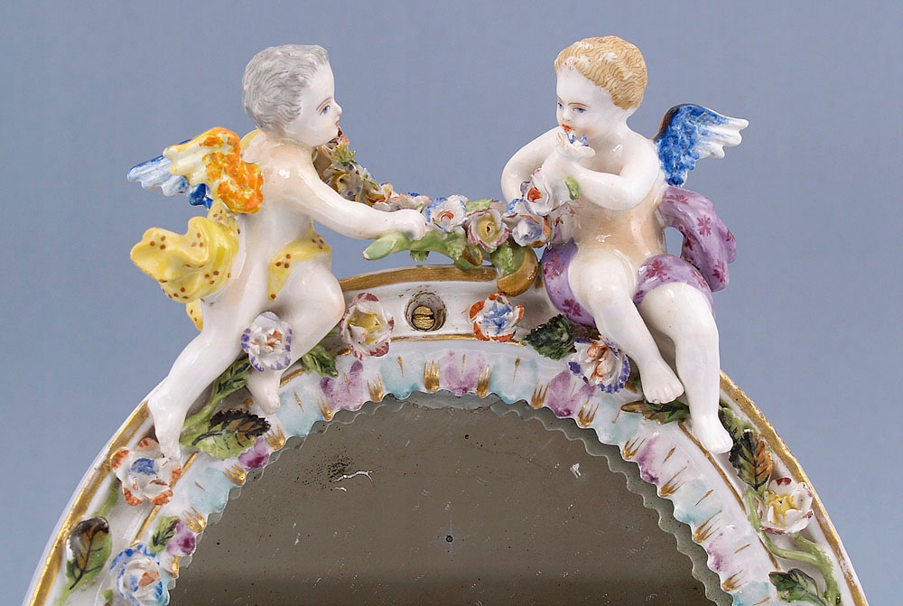 овальній, з рослинним декором по всьому колу та двома путті вгорі. Купідони, оперезані шатами, з різнокольоровими крилами, між собою тримають квітковий вінок. Каркас кріпиться на дерев'яну основу з опорою, а у верхній частині є отвори для підвішування. Дзеркальна поверхня. Порцеляна, надглазурні фарби, підпис угорі, підглазурне покриття кобальтом, літера «Т» із візерунком унизу.