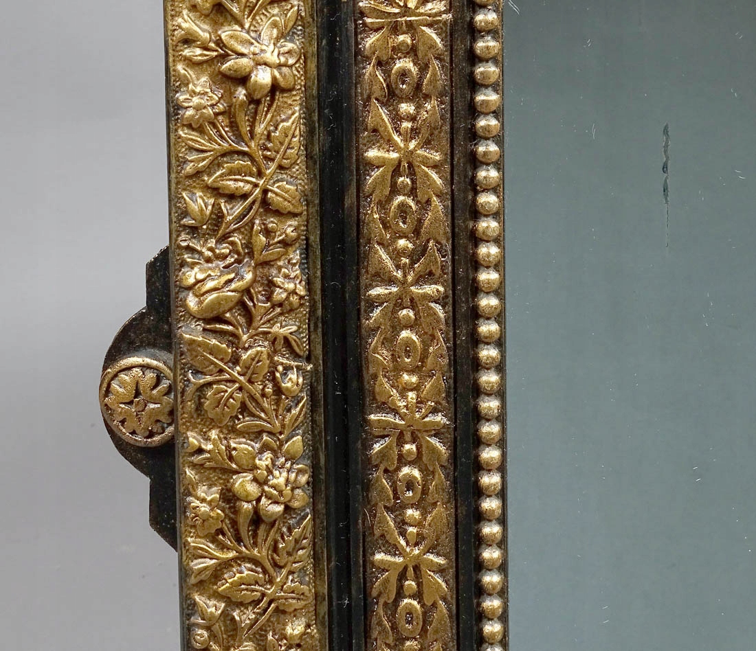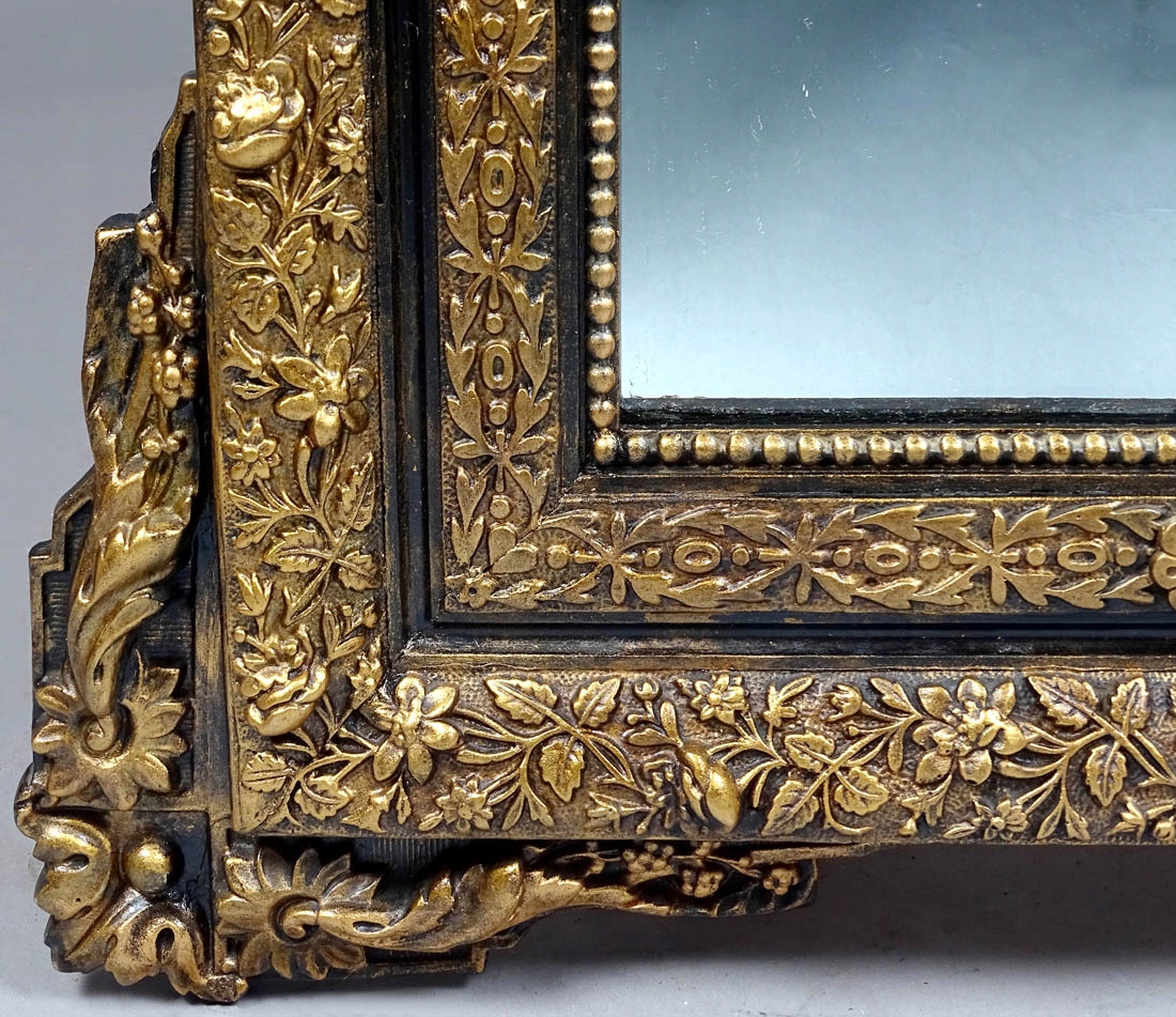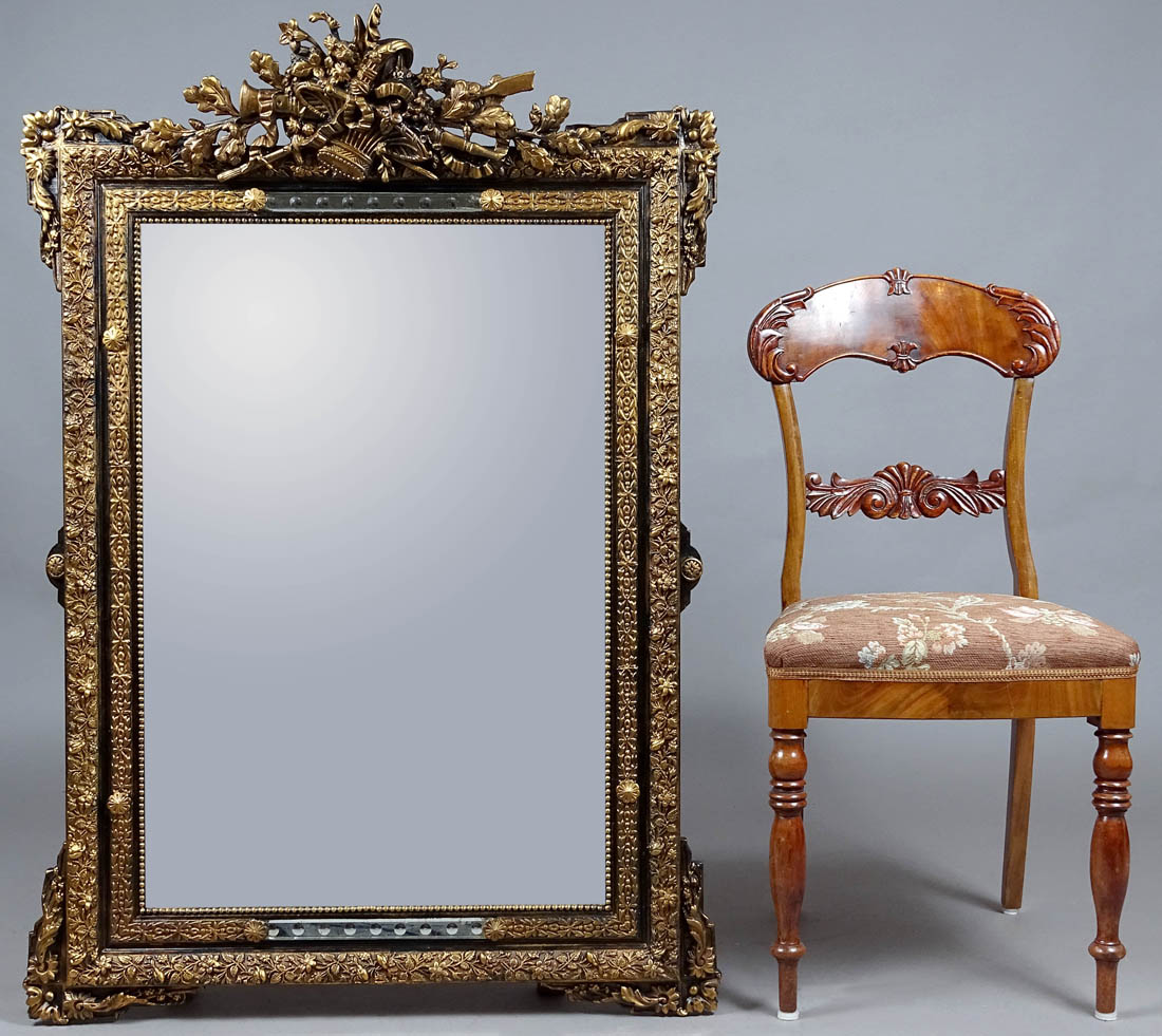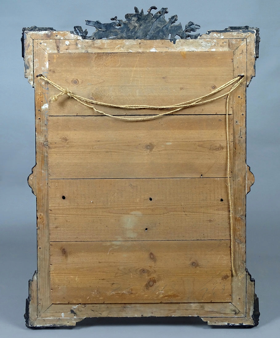 близьке до прямокутника, з багато декорованою широкою рамою. По периметру — прикраси у вигляді позолочених вусиків рослин, а в надбудованих кутах — квіти та листя аканта. Всередині на дзеркальній поверхні витончені намистини і дві вузькі дзеркальні смужки з круглими вставками. Увінчана багатою різьбленою композицією у вигляді кошика з квітами, мушкета та стріли, прикрашеної луком. Зі зворотного боку є два сталевих гачки та мотузка для підвішування.