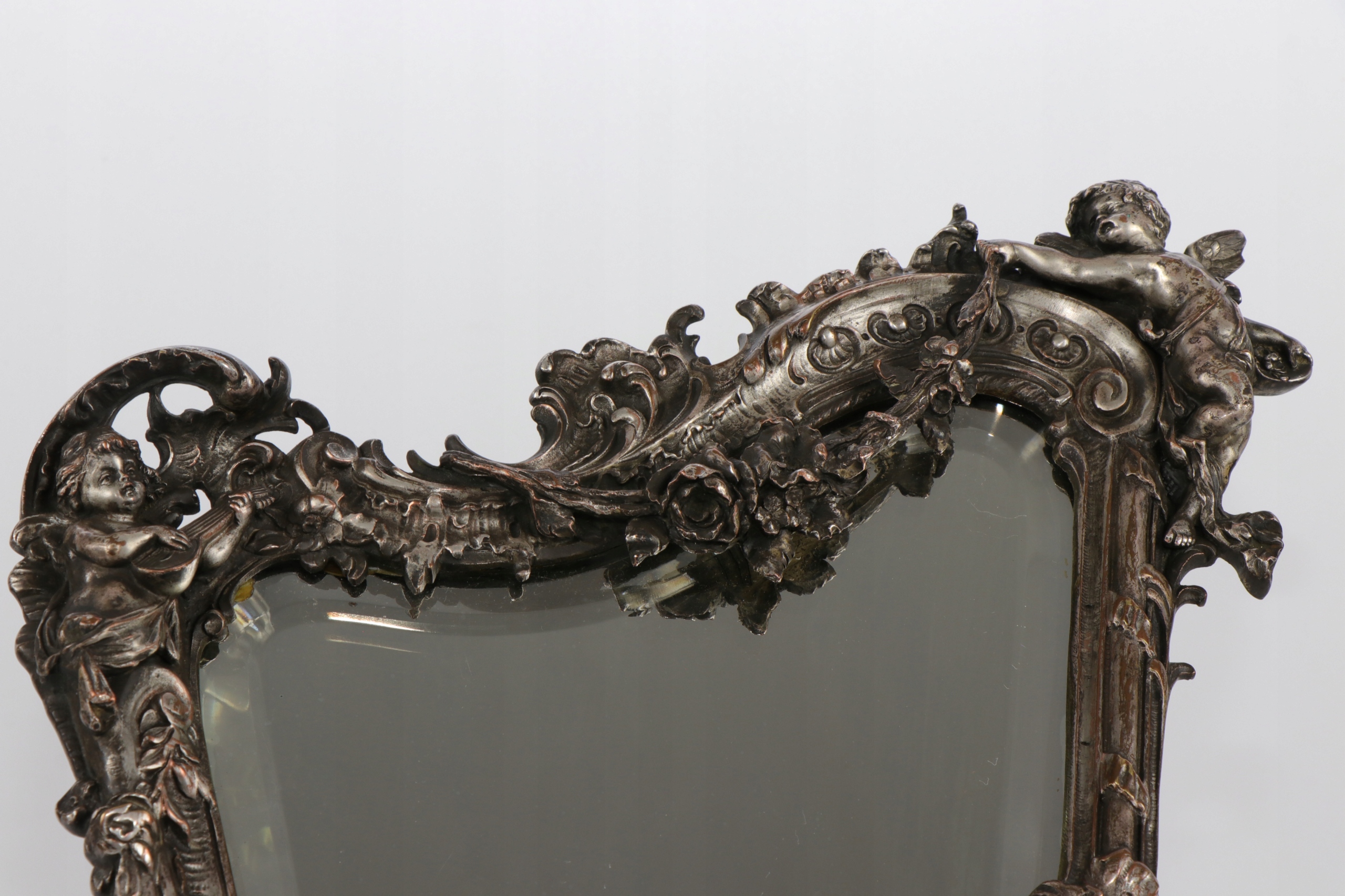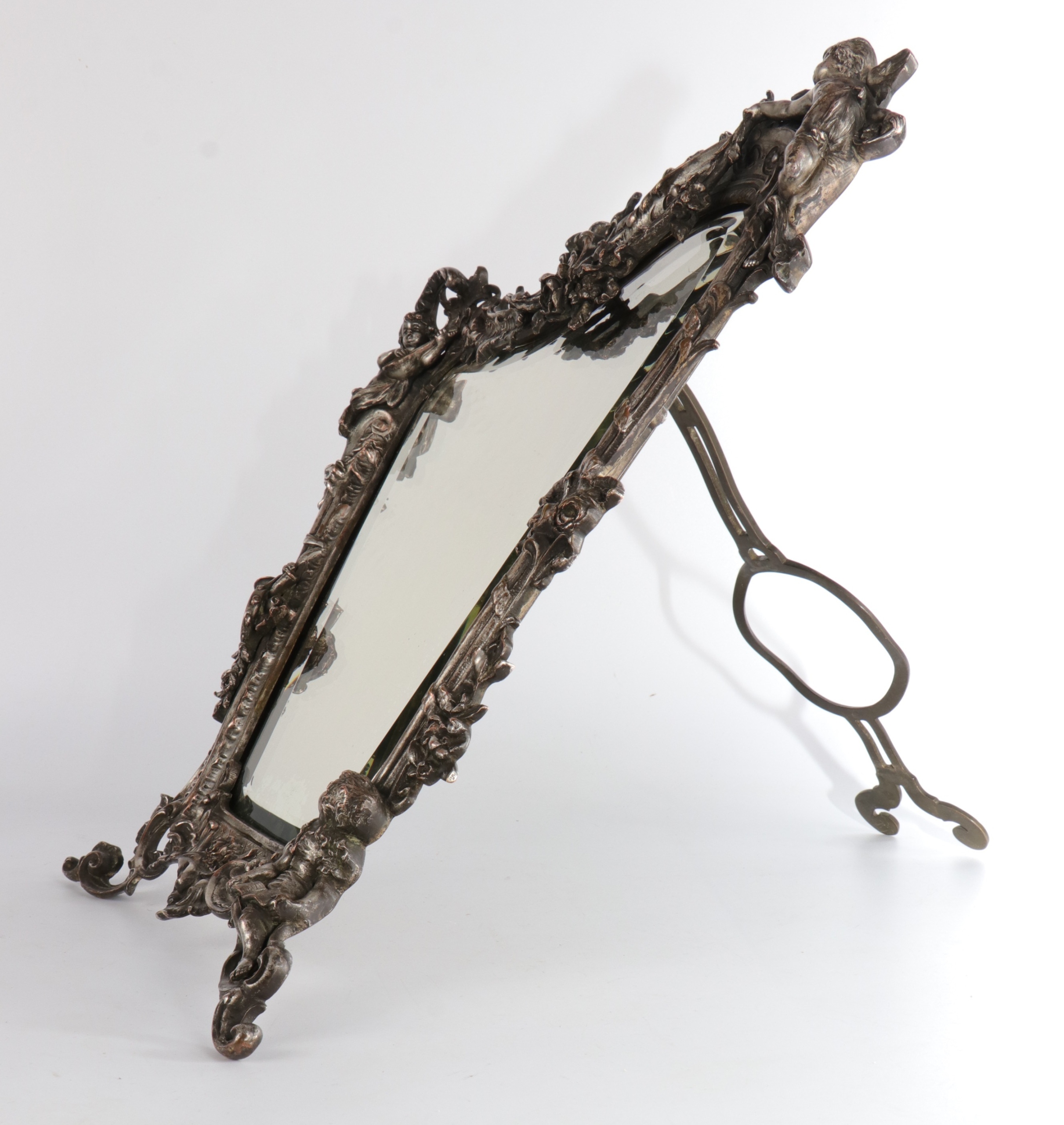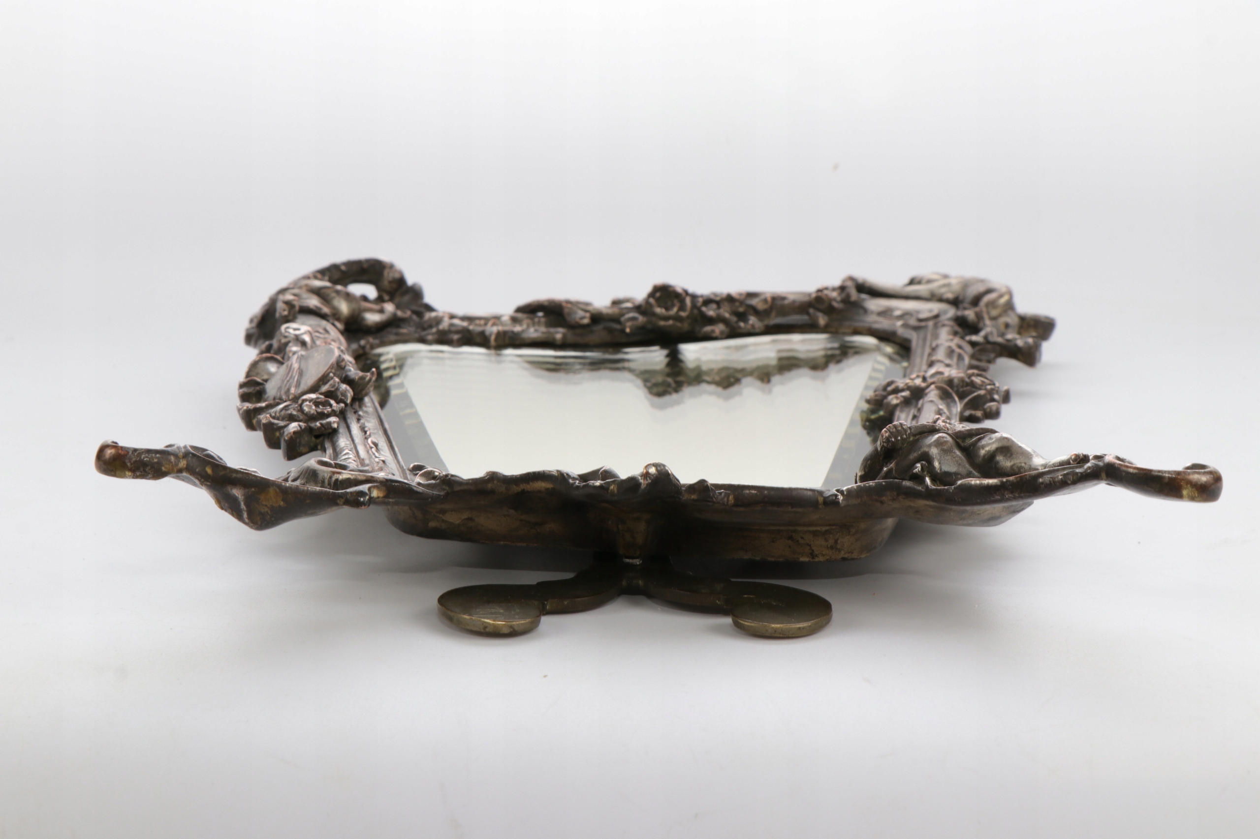 Прекрасне шафне дзеркало в стилі неорококо, багато прикрашене орнаментом у вигляді ангелів та гірлянд. Предмет із литої посрібленої латуні або якогось мідного сплаву. Задня опора з латуні. Дзеркало з оригінальною кришталевою скошеною формою скла.