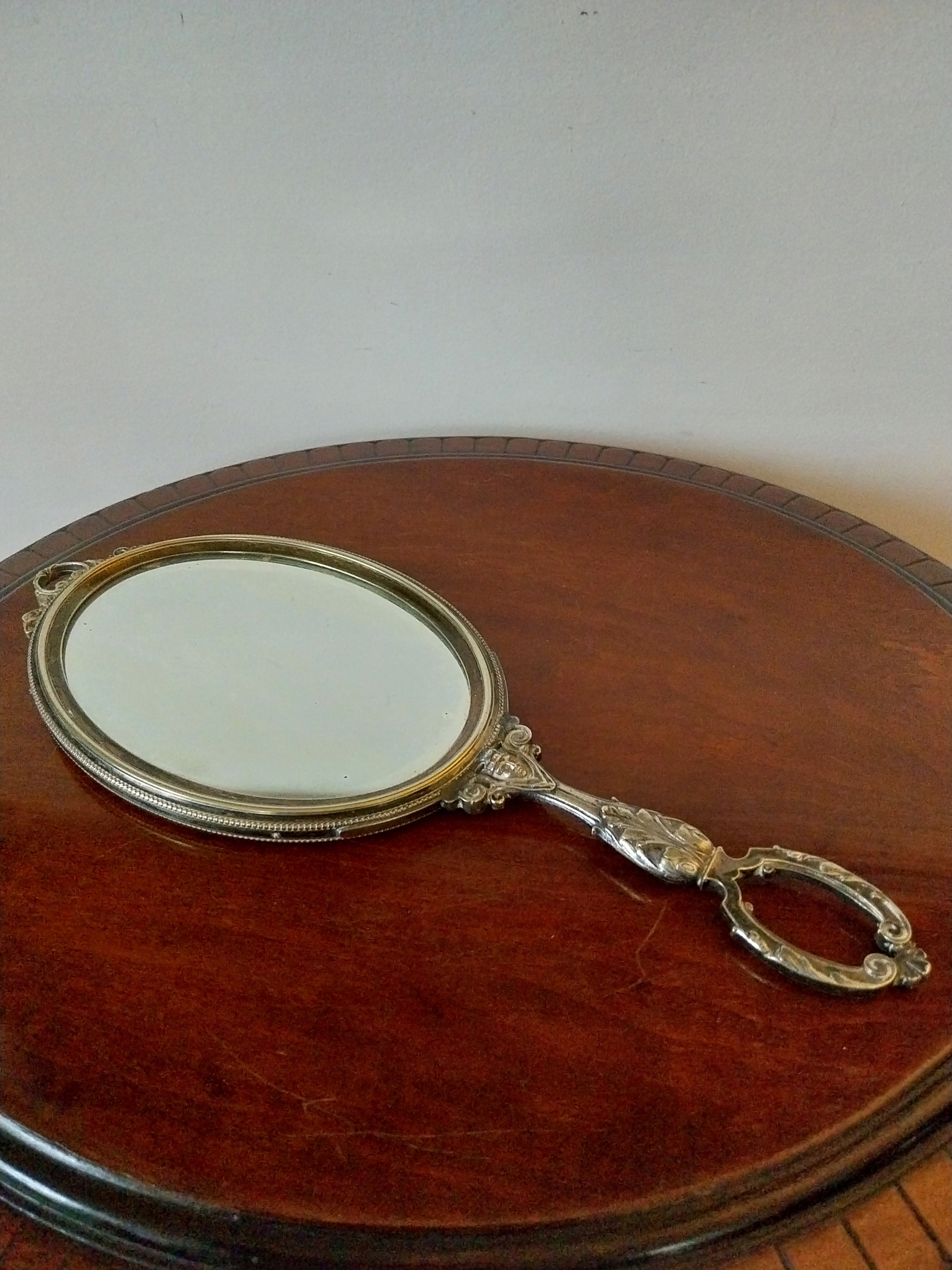 Старе, двостороннє дзеркало з багато прикрашеною ручкою, розмір скла 14 х 9,5 см, загальна довжина 30 см, дуже хороший стан, як на фото