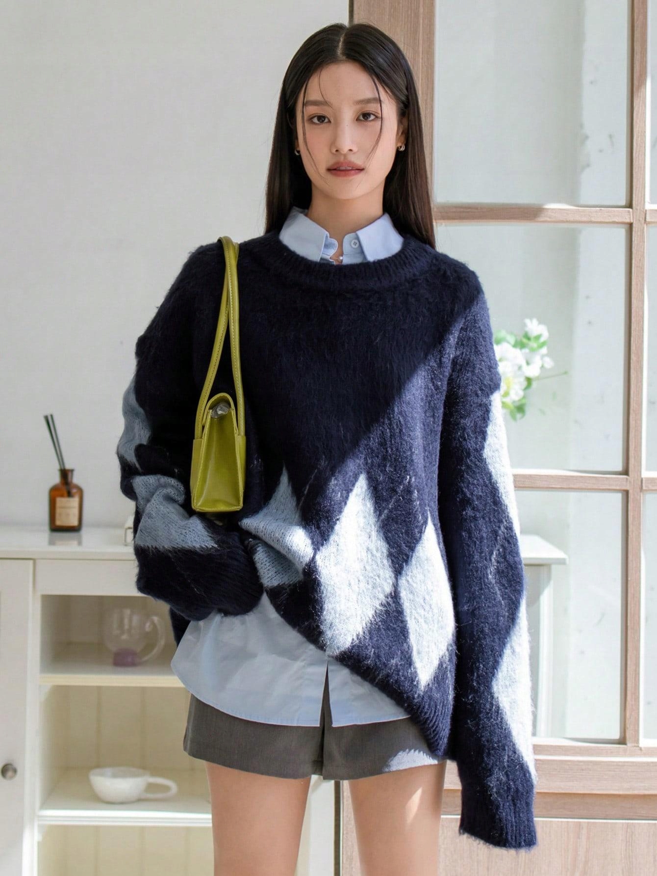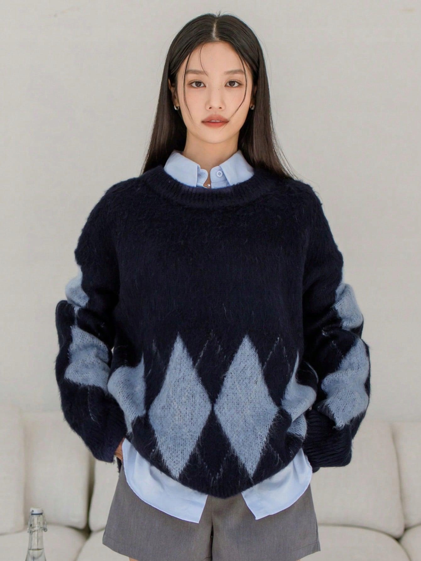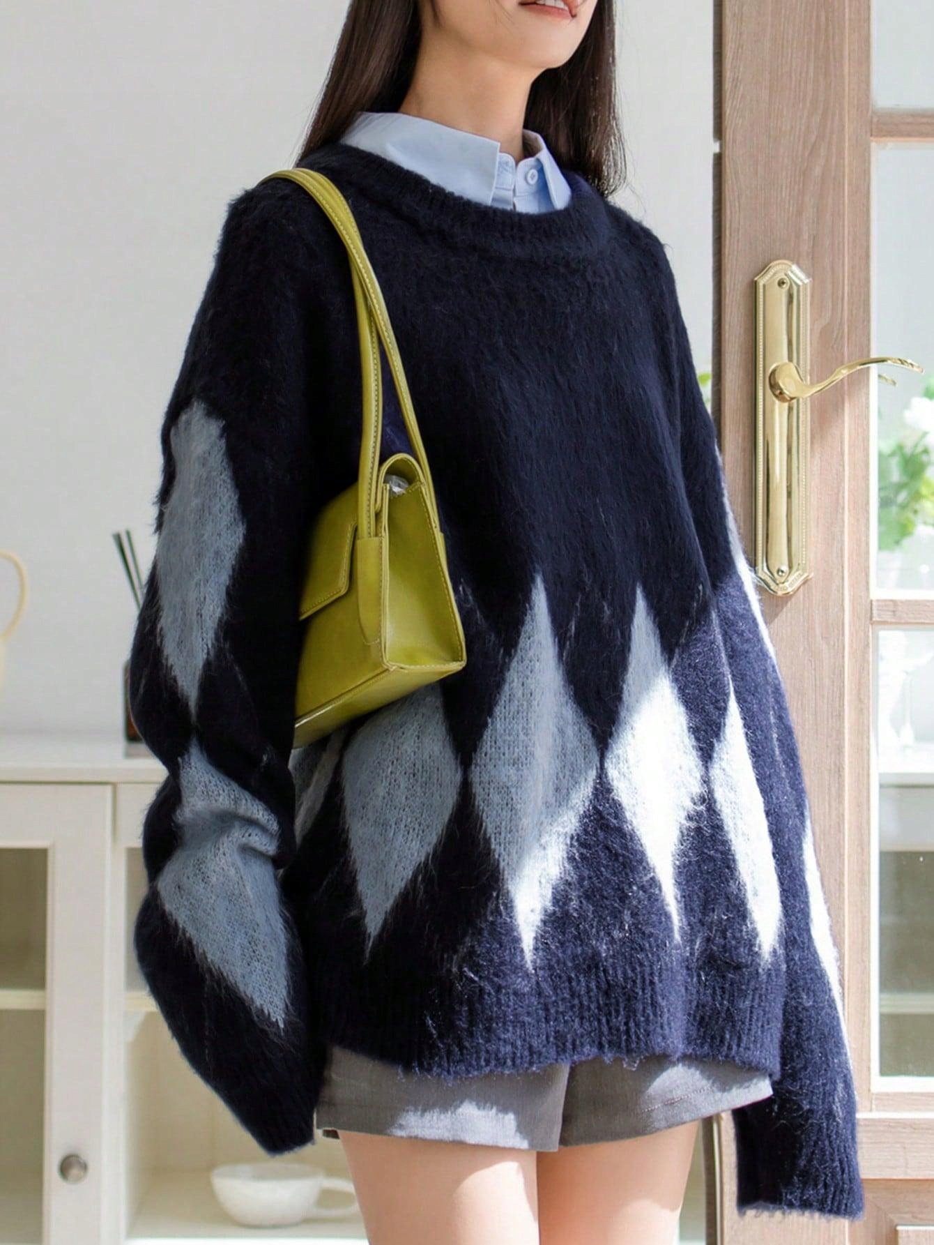 DZIANINA WZÓR GEOMETRYCZNY SHEIN 36 GRANATOWY LUŹNY SWETER OVERSIZE