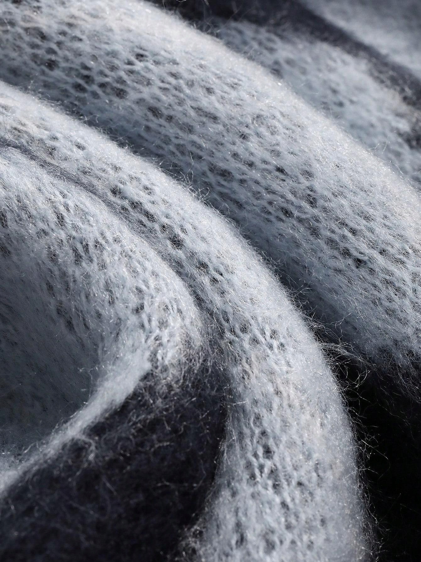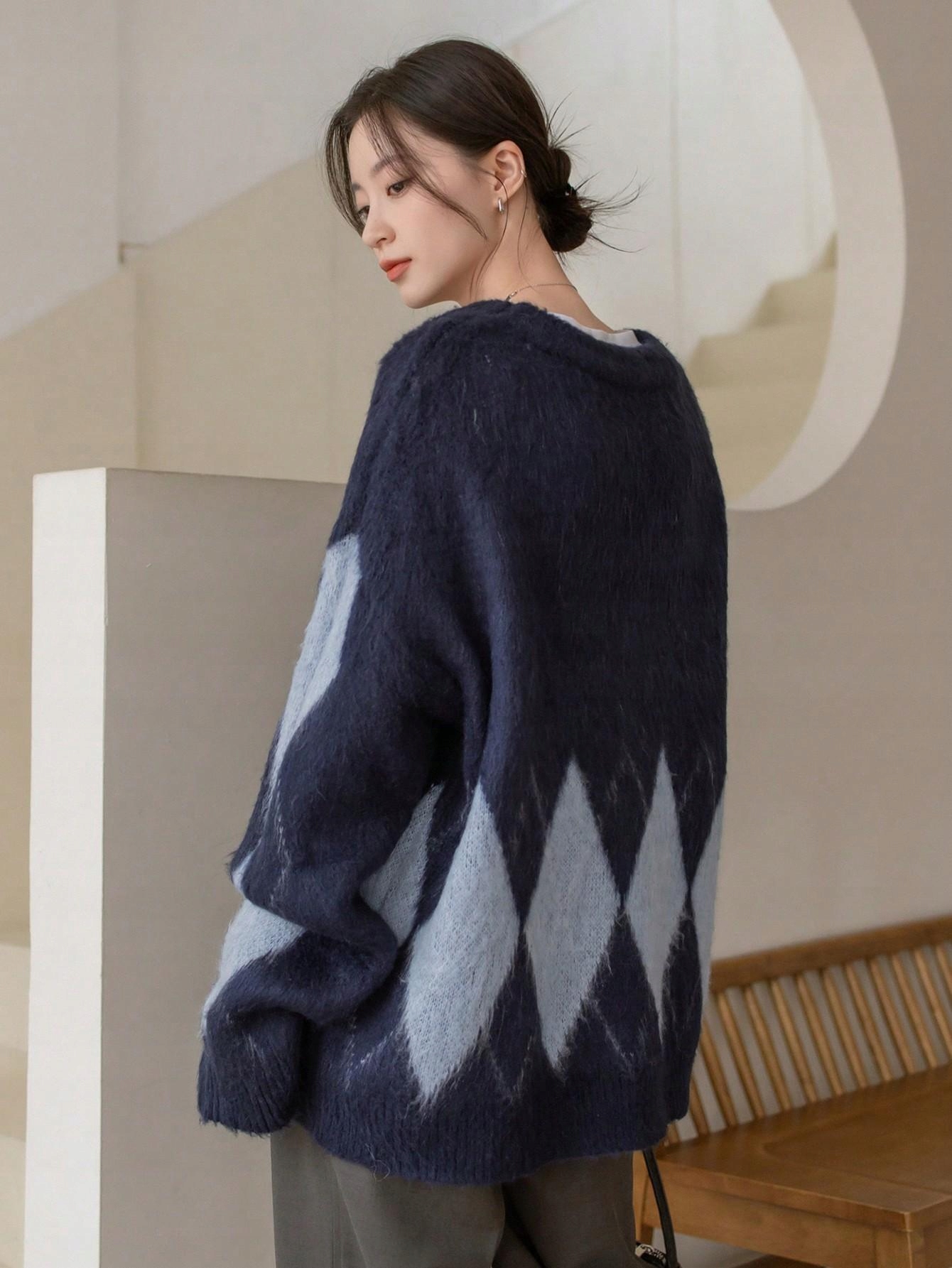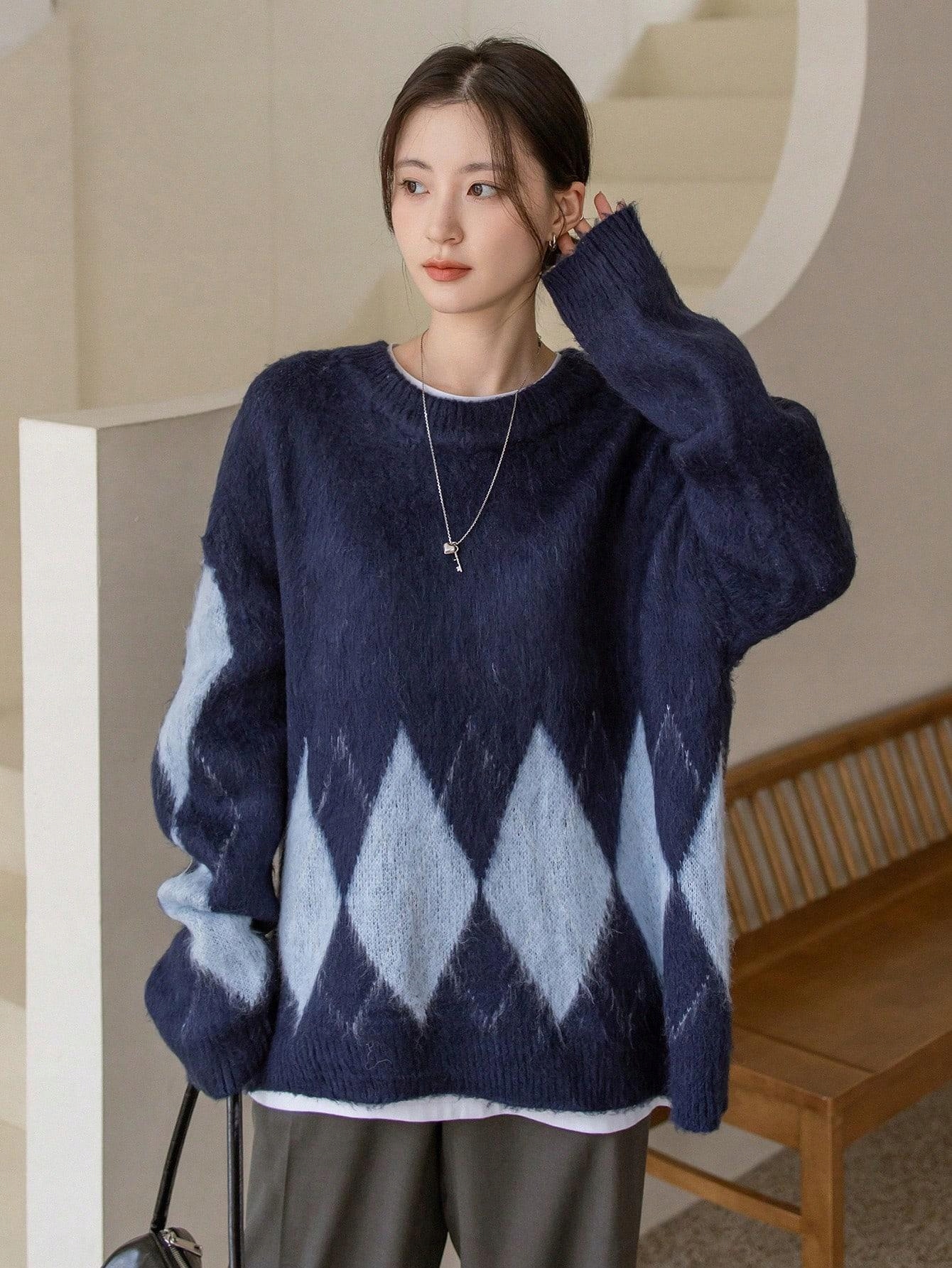 DZIANINA WZÓR GEOMETRYCZNY SHEIN 36 GRANATOWY LUŹNY SWETER OVERSIZE