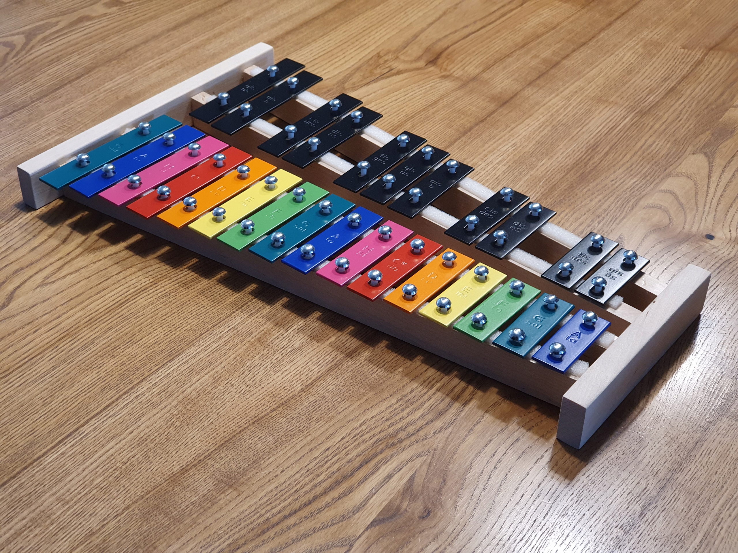 27-тональні хроматичні дзвіночки - дві повні октави з півтонами. Основа виготовлена з дерева, в комплект входять дві дерев'яні палички. Електронно налаштований. На табличках звукові написи.