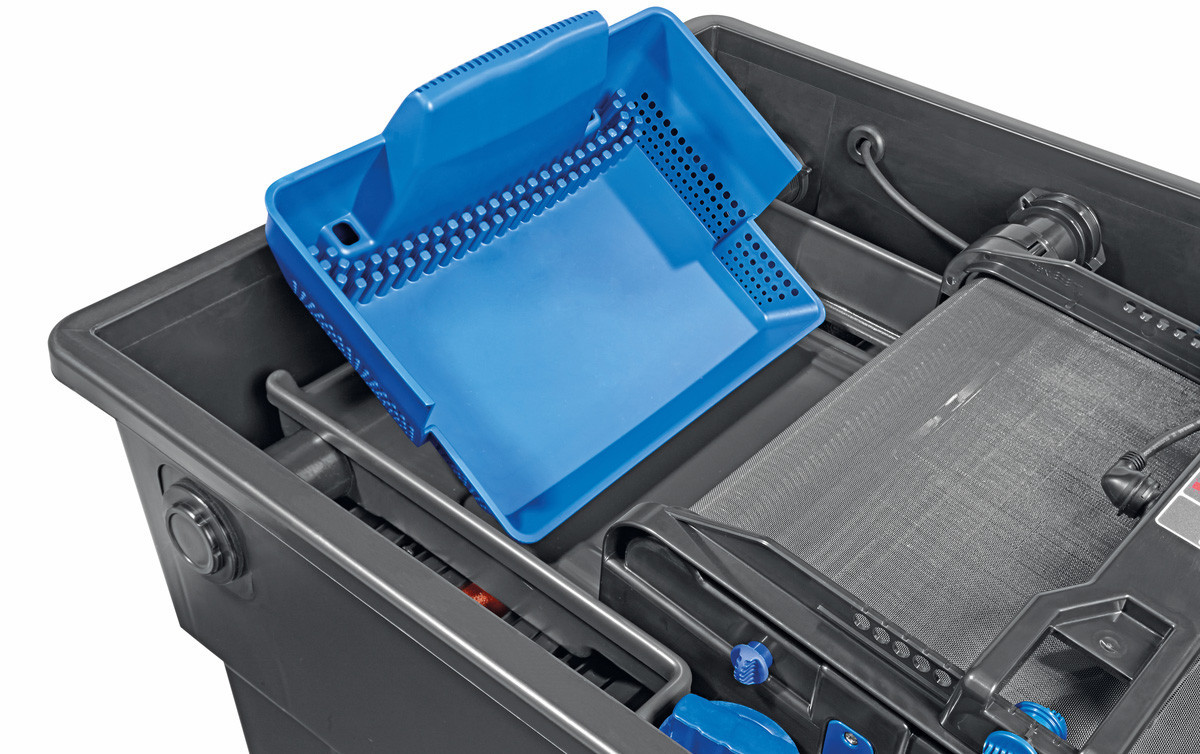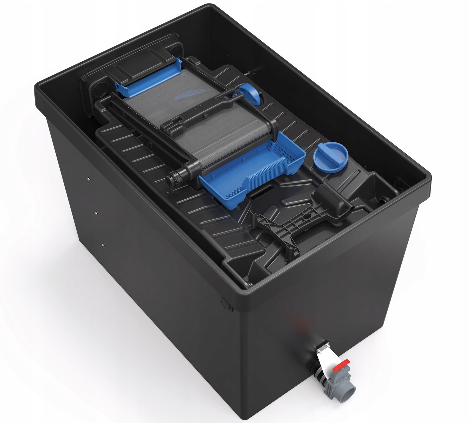 екрана для POND, що рідше піднімається. Бруд відокремлюється перед входом у фільтр. Двосторонній двигун забезпечує набагато довше життя, ніж конкуренція. Регульована система автоматичного очищення забезпечує ефективний рівень розділення. Вихідний отвір без вузьких місць запобігає заторам. Інноваційні захисні бар'єри запобігають промиванням фільтра. Очищення дуже зручне: фільтрувальна стрічка очищається, а губки фільтра очищаються безпосередньо у фільтрі.