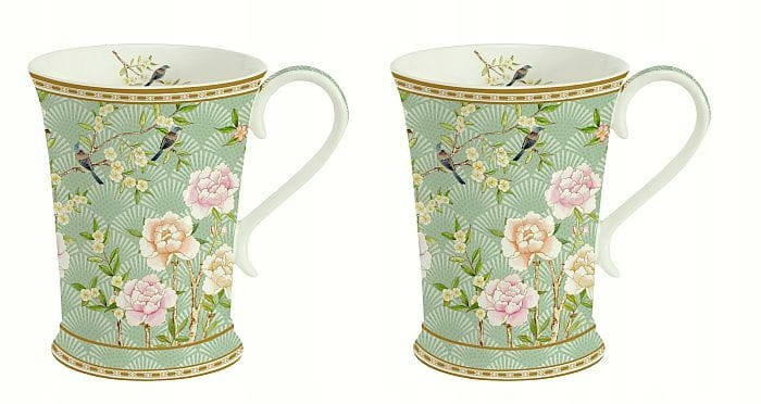 Дві однакові кухлі (270 мл) з порцеляни з колекції Palace Garden з дуже гарним, привабливим і візуально оригінальним мотивом квітів і птахів на фісташковому тлі.