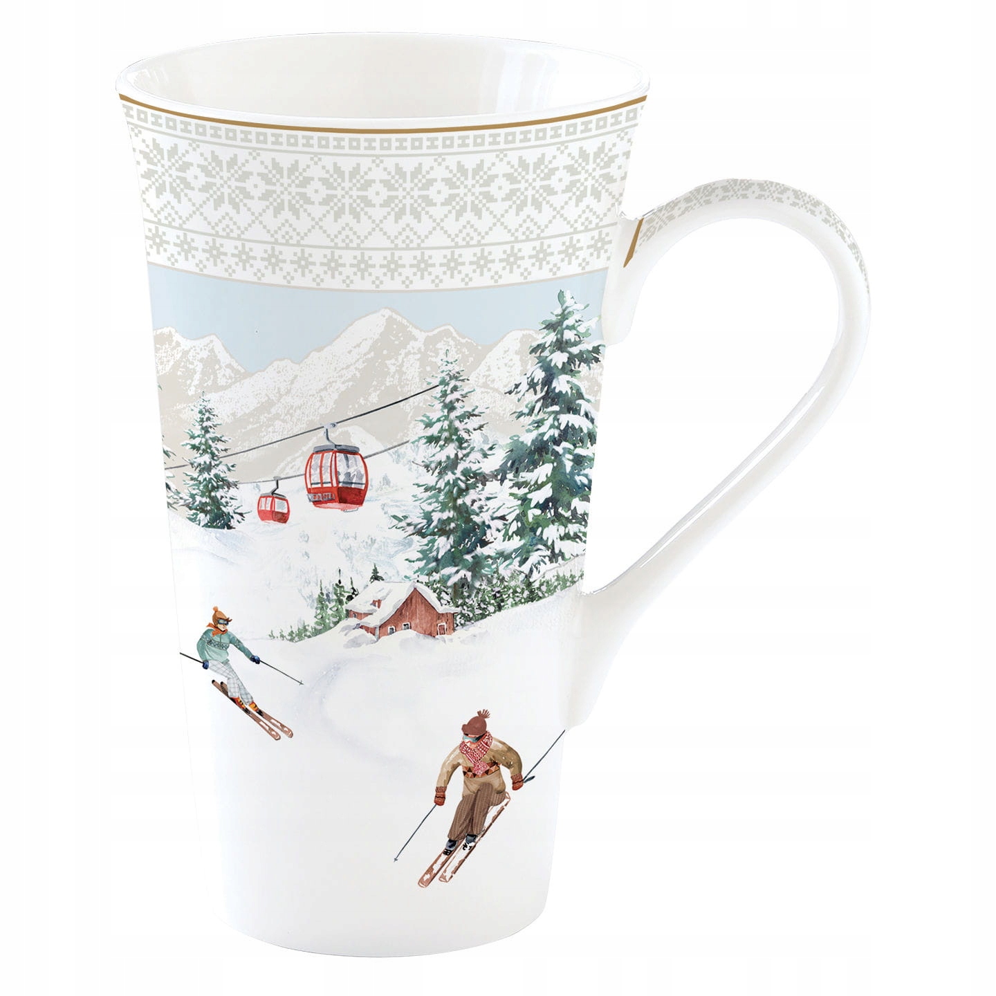 Високий і великий кухоль об’ємом 600 мл, частина досить великої колекції В горах, катання на лижах (бренд італійського бренду Easy Life/Nuova R2S) з оригінальним зимовим мотивом із зображенням лижників на схилі, виготовлений із високоякісної, блискучої, щільної порцеляни, тобто «Fine China II»