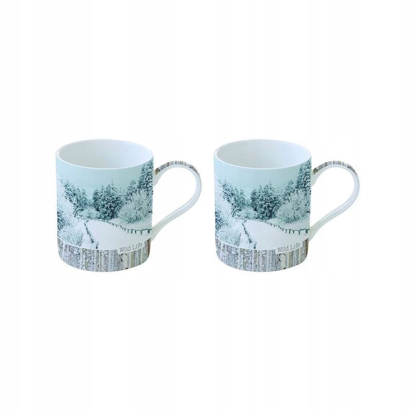 Дві однакові зручні кухлі Wild Life Coll. (у зимовому варіанті) з білої щільнішої порцеляни, традиційної форми з гарним оригінальним мотивом - фото зимового пейзажу ( мотив ідентичний з обох боків)., дно чашки: навколо стовбури беріз).