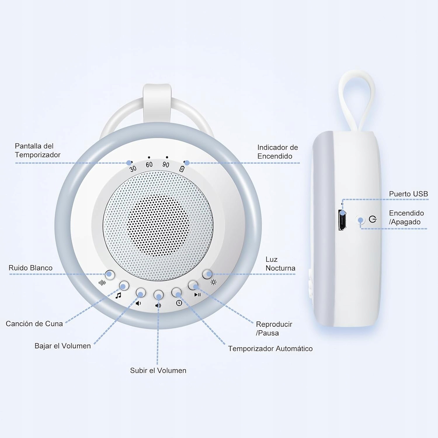 - Довгий термін служби батареї та різноманітні звуки: акумуляторна батарея заряджається через кабель Micro USB (в комплекті) забезпечує до 20 годин роботи на одному заряді. Пристрій пропонує 16 заспокійливих звуків: 4 білі шуми, 4 звуки вентилятора та 8 природних звуків (море, колискові, вода, що тече, багаття, спів птахів, грім, звуки потяга, звуки материнської утроби