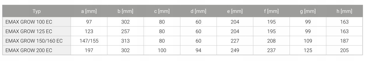 Вентилятор Emax Grow був оснащений синджем синхронним EC Motion Engine EC та ротором з спеціально профіленими лезами. Вимірювання температури у вентиляційному просторі проводиться зовнішнім датчиком, підключеним до пристрою, з 4-м метром кабелем. Після зниження температури на потрібний рівень пристрій повертається до встановленої швидкості.