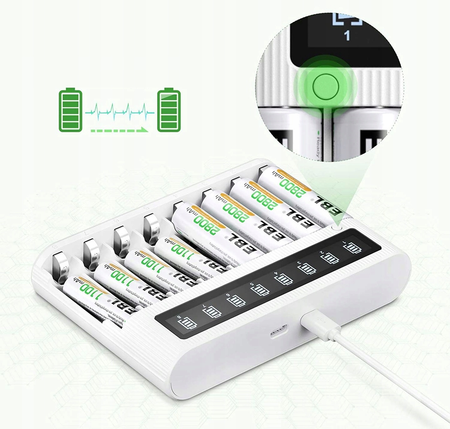 Висока потужність: 4 батареї 2800 мАг АА та 4 батареї 1100 мАг AAA, можуть бути заряджені до 1200 разів та забезпечити надійне джерело живлення. Дуже низька функція самопочуття дозволяє акумуляторам підтримувати близько 90% ємності, навіть якщо вони не використовуються протягом 1 року. 4 А РК -монітор може відображати заряд акумулятора, переконайтеся, що акумулятори завантажуються з великою швидкістю.