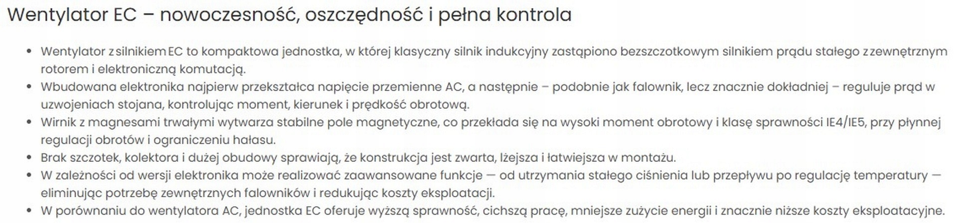 - Якщо у вашій установці обробки повітря все ще використовуються традиційні вентилятори з двигунами змінного струму, подумайте про заміну на сучасні вентилятори з електродвигунами. Завдяки цій технології ви можете заощадити до 30-50% енергії. Нижче ми представляємо основні відмінності між вентиляторами EC і AC.