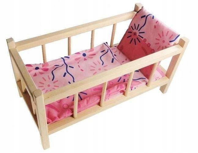Лялькове ліжко виготовлене з високоякісної деревини. Виглядає як справжнє ліжко, має дерев'яну конструкцію, дерев'яні щаблі та дощату основу. У набір входить постільна білизна для ляльки в тон до ліжечка.