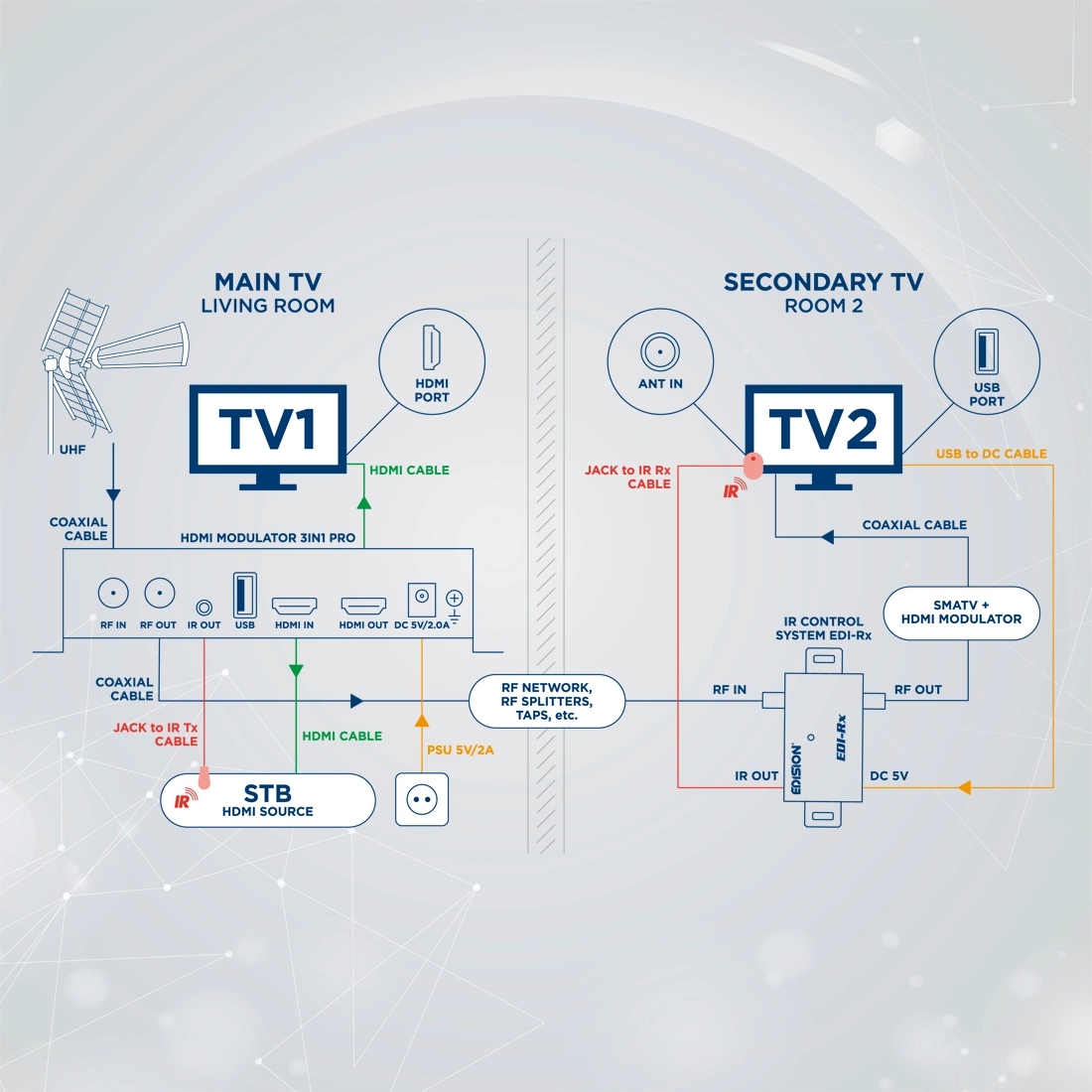 ☑️ Інтегрований ІЧ-передавач: Повний контроль над джерелом сигналу (наприклад, декодером) із будь-якої кімнати за допомогою стандартного дистанційне керування через той самий коаксіальний кабель (потрібен додатковий приймач EDI-Rx).