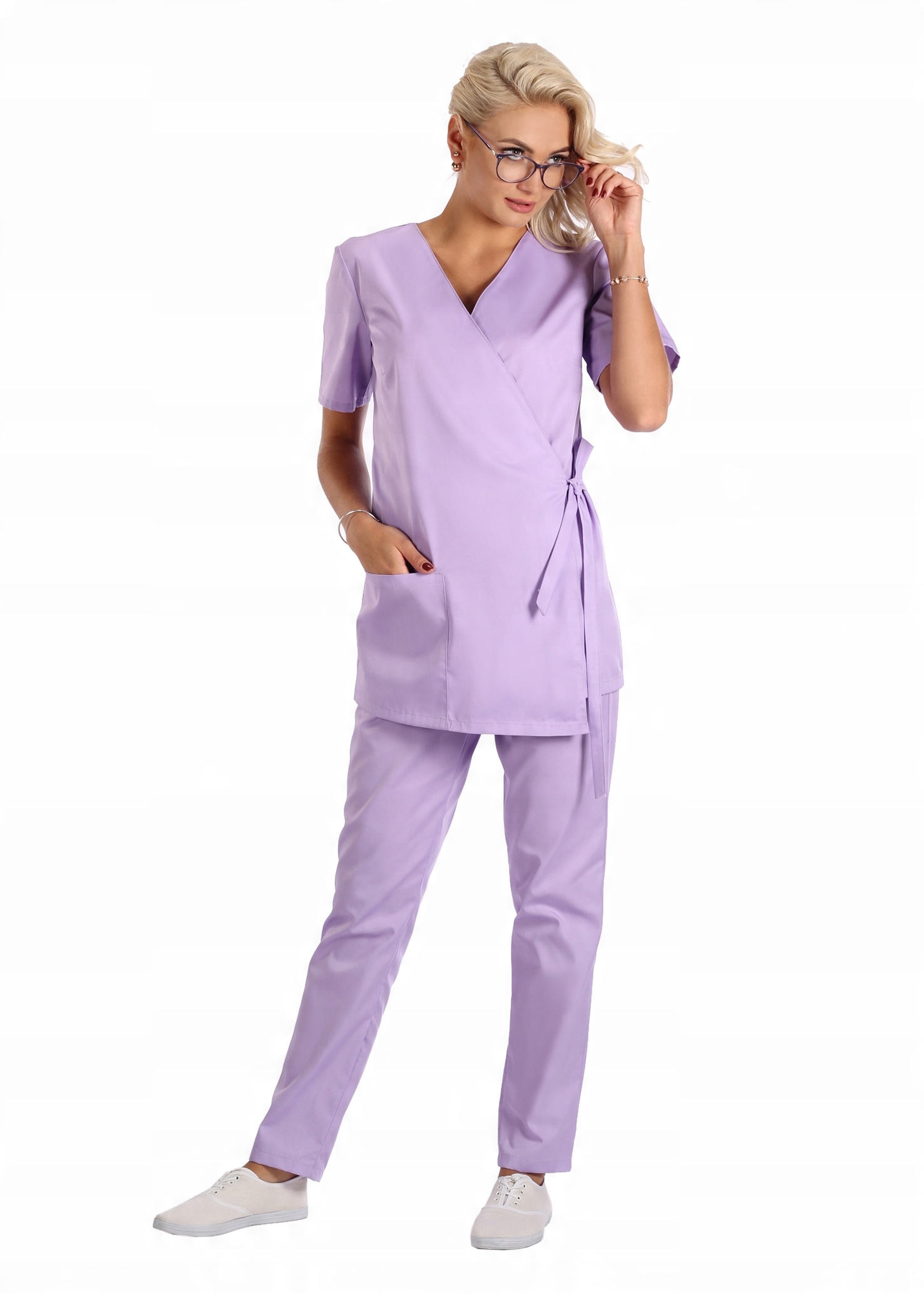 Медико-косметична блузка, стиль кімоно. Боки світшота зав'язуються з обох сторін, що дозволяє підігнати будь-яку фігуру (звідси комбіновані розміри). Одна з лицьових частин злегка скошена, красиво подовжуючи силует. Цей світшот трохи довший за класичні медичні світшоти. Короткі рукави, подвійна кишеня на рівні стегна справа (у меншу кишеню вміщається смартфон).