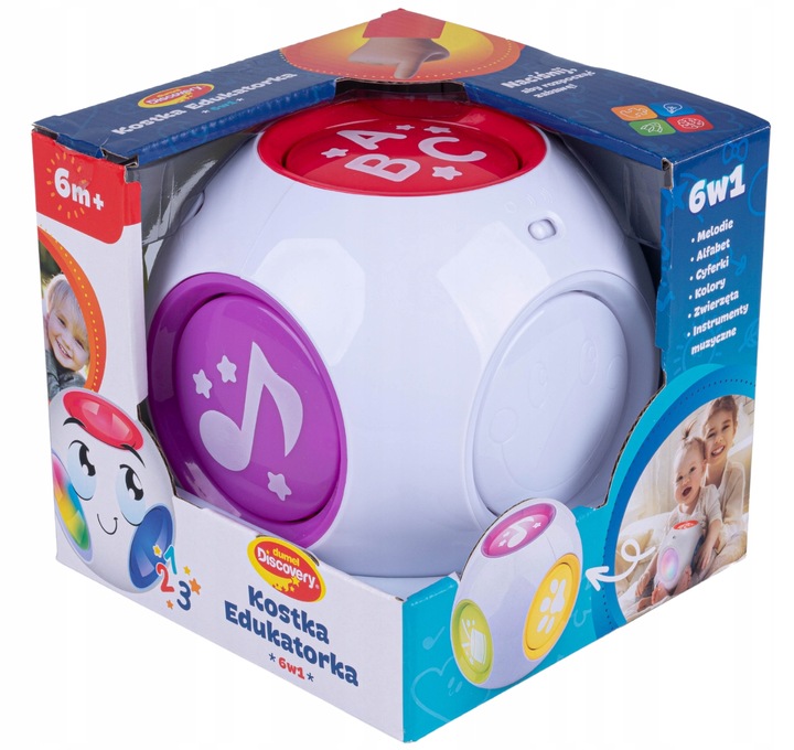Навчальний тактильний куб, повний звуків і кольорів, розважить вас 6 різними способами! Він містить звуки музичних інструментів, звуки тварин, слова польською мовою: назви кольорів, букв і цифр, веселі мелодії. Окремі звуки активуються, торкаючись кольорових стін із символами, що відповідають певним режимам гри. Куб має регулятор гучності і перемикач звуку. Іграшка призначена для дітей від 6 місяців. Особливості іграшки: - іграшка розмовляє польською - регулятор гучності - 6 кольорових стінок: мелодії, алфавіт, цифри, кольори, тварини, музичні інструменти - вік: 6м+