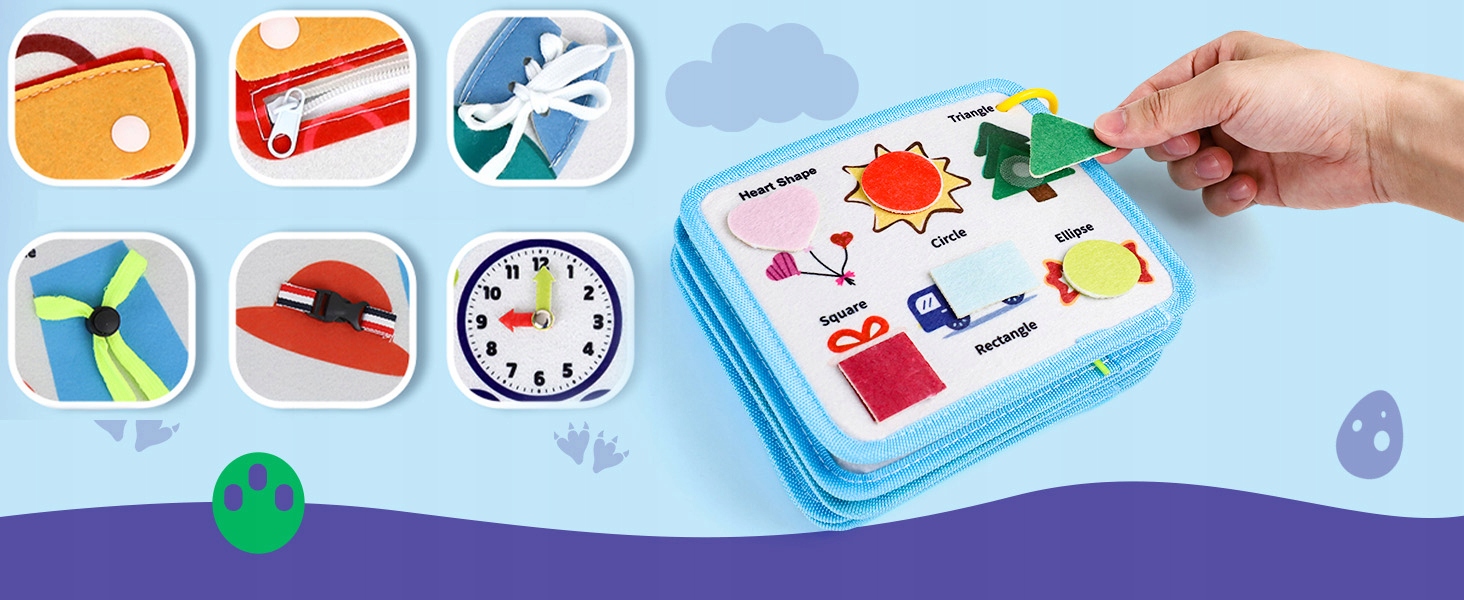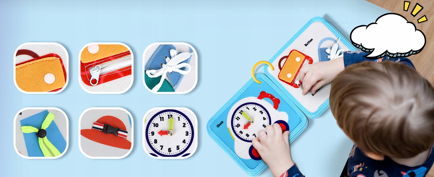 Дошка життєвих навичок, натхненна Монтессорі, пропонує 5 сенсорних вправ, зокрема пряжки, блискавки, шнурки, застібки та годинники. Імітує сценарії реального життя для розвитку основних навичок, покращення логічного мислення та навичок вирішення проблем, одночасно вправляючи на дрібну моторику, координацію рук і очей і спритність.
