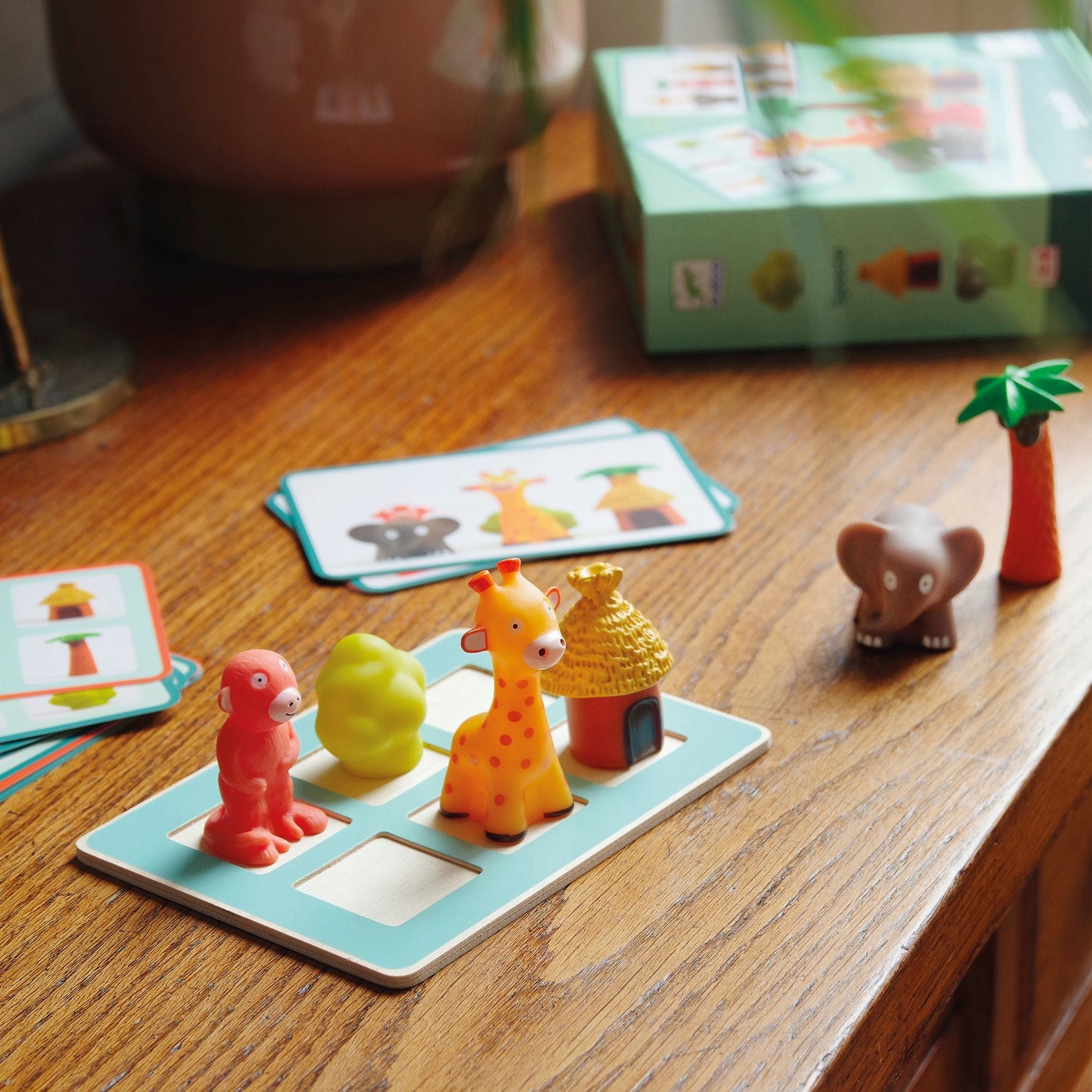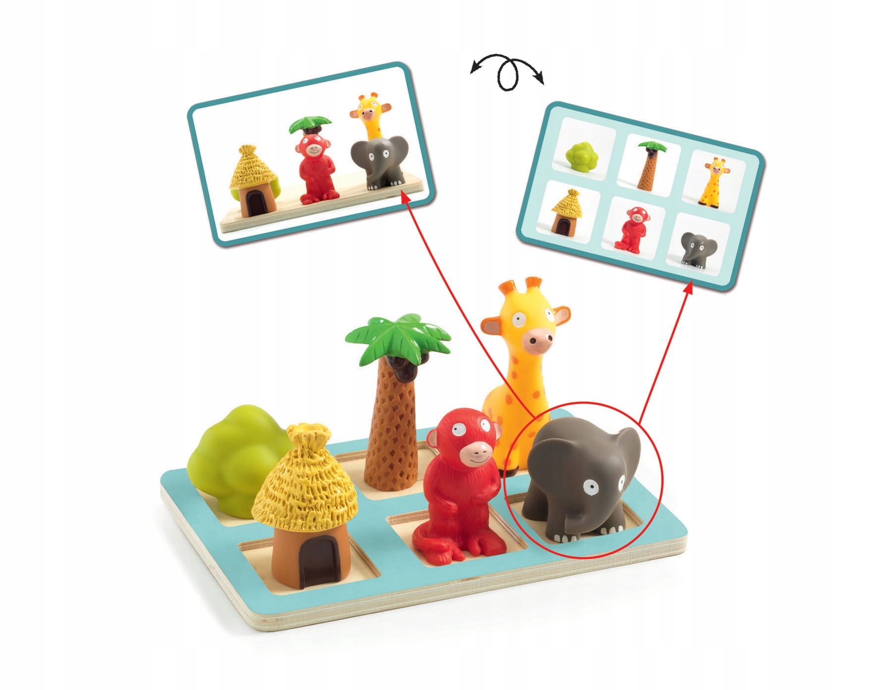 орієнтація в просторі Spacio Eduludo - це гра, що містить 20 карт із зображеннями та 6 статуетками тварин та 1 дерев’яною дошкою. Щоб відтворити схеми, показані на картці, дитина повинна правильно встановити фігури на дошці: де жирафа? До Сłоні чи ззаду? Рішення представлені на звороті карт. Це відмінне навчання через гру.