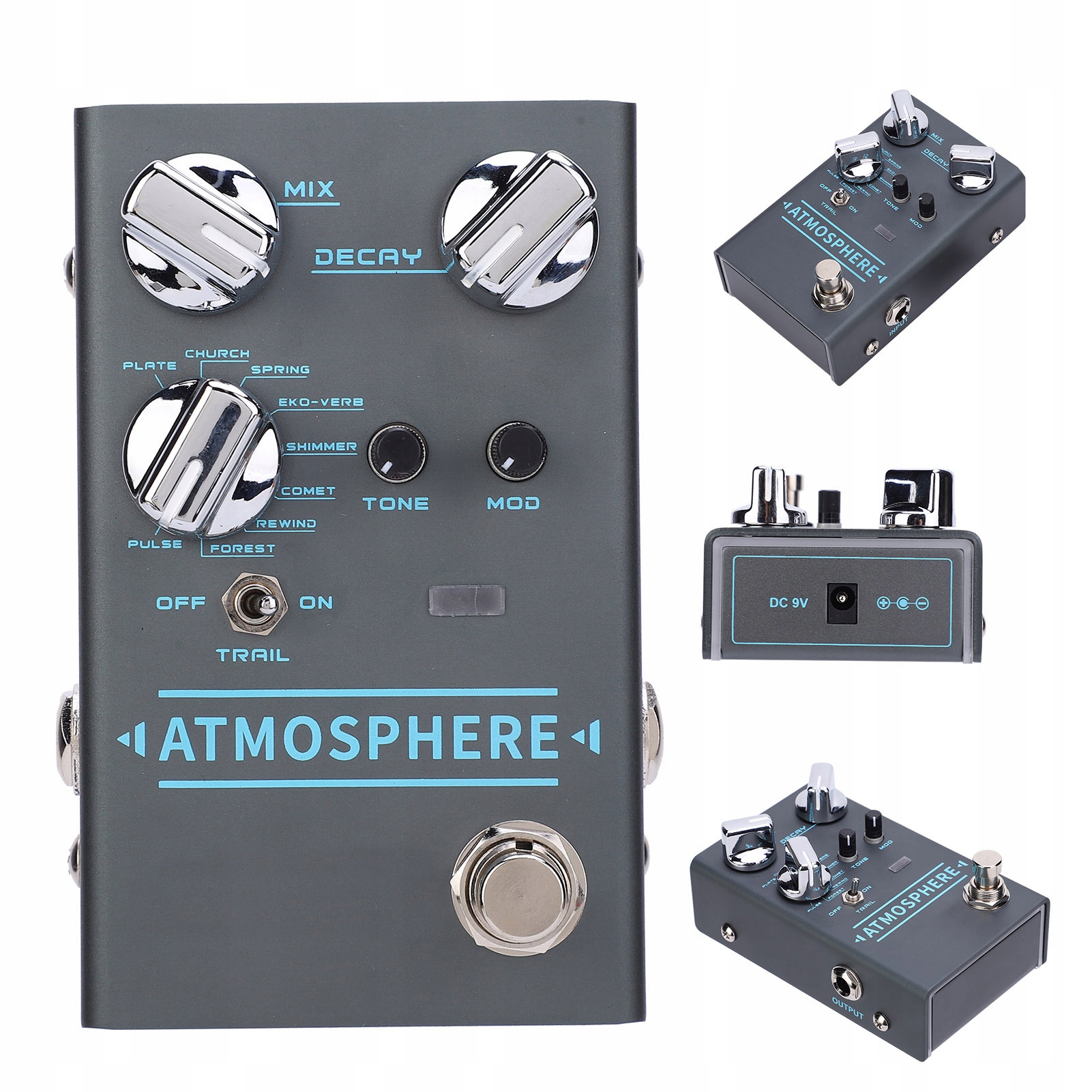 ⏺ Вбудовані 9 типів цифрової реверберації, включаючи SPRING, CHURCH, PLATE, EKO‑VERB, SHIMMER, COMET, REWIND, FOREST , PULSEна додаток до традиційних регуляторів MIX, DECAY і TONE, має спеціальний регулятор глибини для ефектів модуляції. Перемикач функції TRAIL використовується для ввімкнення функції Trail, дозволяючи вимкнути звук ефекту та отримати більш природний звук між увімкненням і вимкненням
