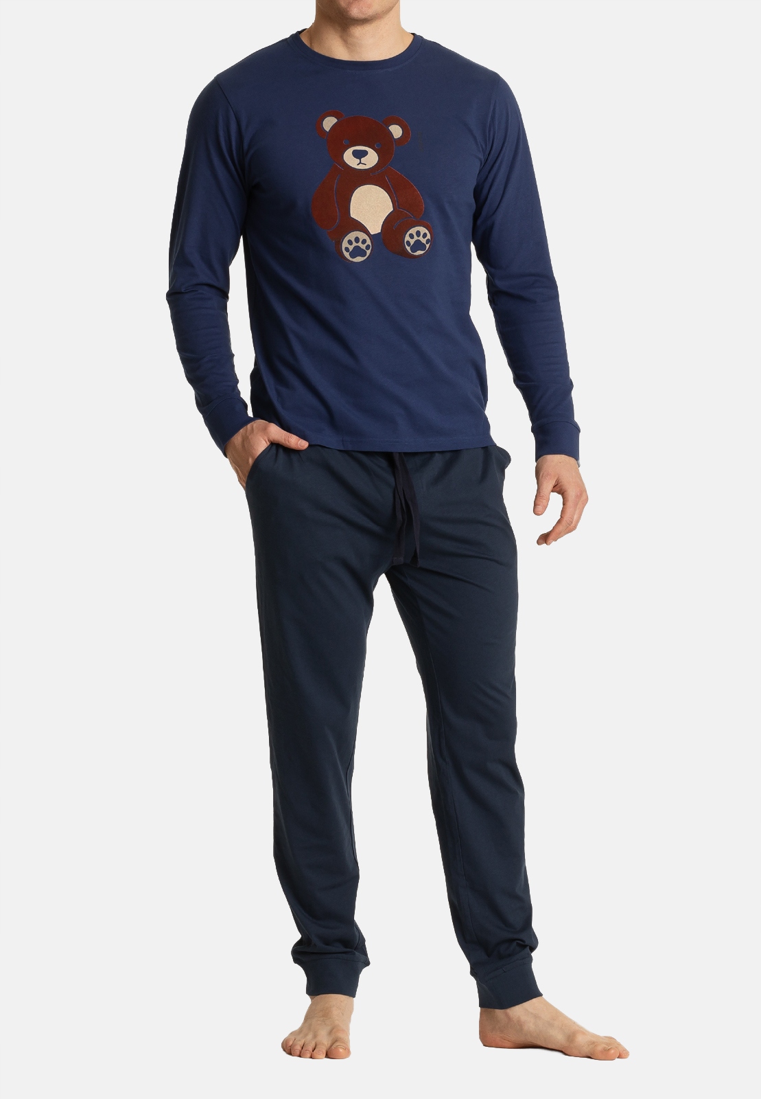 Чоловіча піжама складається з темно -блакитної гори з зображенням плюшевого ведмедика на передній та темно -синій штанах. У верхній частині зіткнувся злегка прилеглий до тіла, круглий розріз на шиї і довгі рукави. Розпущені штани мають практичні кишені з боків і зв'язування на струні на талії, ноги закінчені зручними зійшками . Паджами виготовлені з м'яких і приємних до сенсорної бавовни, яка збагачена таким чином, що викликає ефект персика ("ефект персика"), що означає, що трикотажний одяг покритий крихітним розміром, пухнастим волоссям, що робить його на дотик, що нагадує оксамитову персикову шкіру.