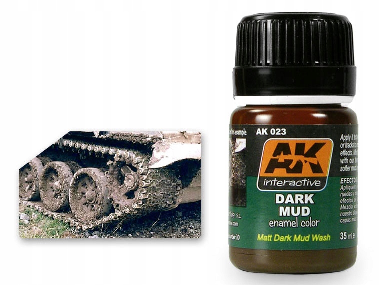 Ефект темно-землистого кольору можна використовувати окремо або в поєднанні з іншими землистими тонами. Нанесіть і розгладьте чистим пензлем, змоченим розчинником для емалі. Створіть своє власне темне скупчення бруду та бруду, додавши цей колір до штукатурної основи. У результаті виходить ультрареалізм, і можна легко досягти будь-яких ефектів. Його також можна наносити безпосередньо на гусениці, колеса або корпуси транспортних засобів. Цей продукт є емаллю, його можна змішувати з іншими фарбами AK Interactive і розбавляти White Spirit.