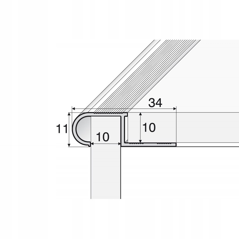 Сходовий кутник з анодованого алюмінію, розміри 11 мм на 34 мм. Сходовий кутник кріпиться шурупом, який пригвинчується зверху (в ширшому плечі просвердлені отвори), коли необхідно щільно затягнути (притиснути) кутник на сходах (біля панелей) або склеюється теракотою товщиною 10 мм/ керамічні вироби. Сходові кутники мають подвійне призначення: практичне і декоративне. Щоб найкраще реалізувати свої практичні властивості та бути довговічними, вони виготовлені з високоякісного алюмінію, а зовнішнє рифлене плече кутника є елементом проти ковзання.