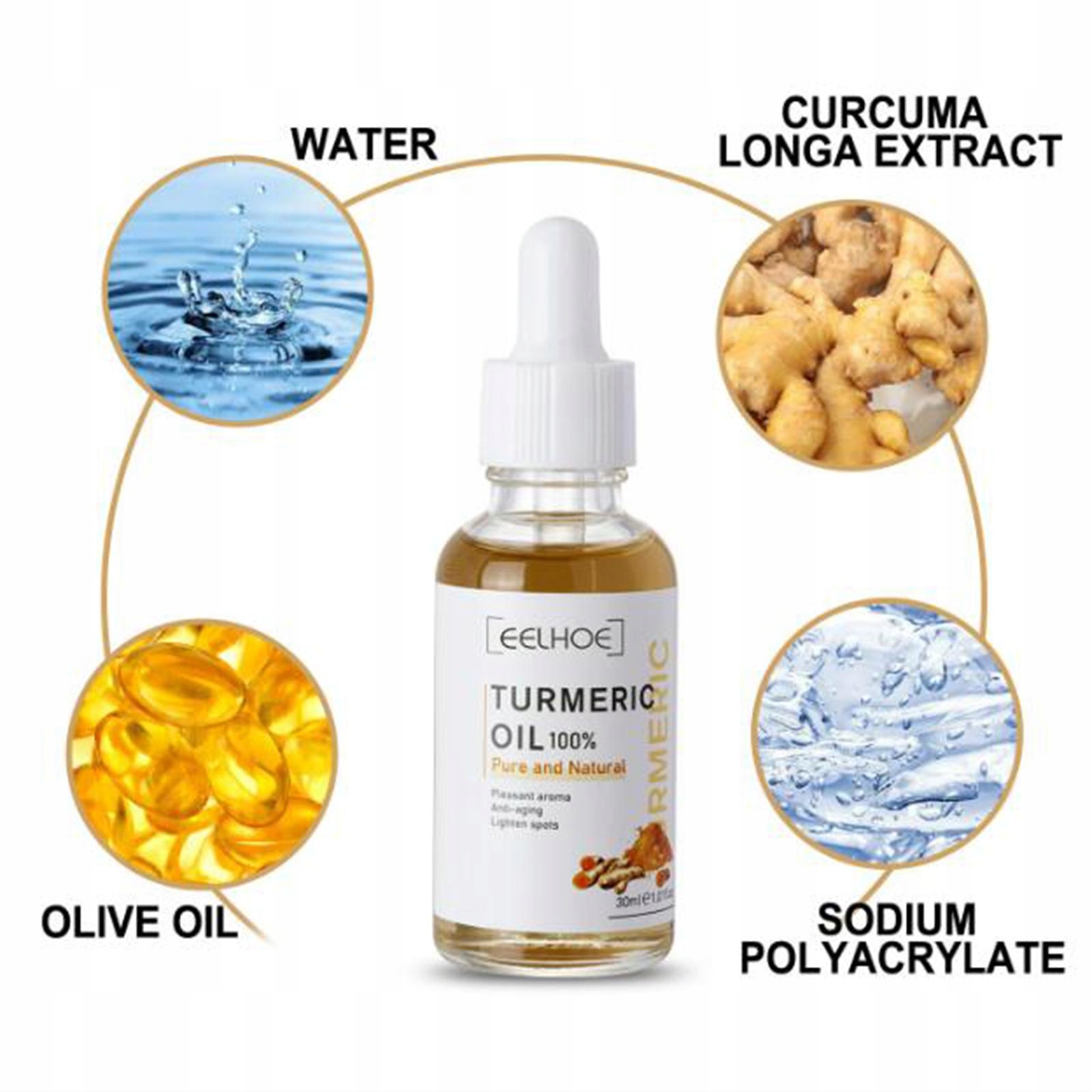 - Стабілізує шкіру: олія куркуми допомагає збалансувати шкіру, зберігаючи її здоровою та зволоженою. Це також сироватка для обличчя, яку можна використовувати як зволожуючу олію, щоб зменшити тонкі зморшки та запобігти появі зморшок.