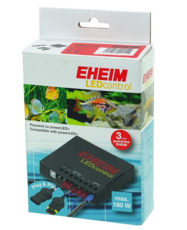 Ви можете керувати EHEIM Pwaylen +Educator за допомогою світлодіодного управління EHEIM. Обсяг роботи включає багато заздалегідь налаштованих програм для процесу освітлення у прісноводних та морських акваріумах. Програму можна створити швидко та легко створити на комп’ютері. Ви можете підключити декілька світлодіодів із загальною потужністю 180 Вт. Контролер управління світлодіодом EHEIM підключений до комп'ютера за допомогою USB -кабелю
