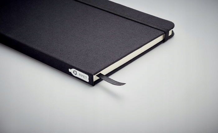 Екологічно чистий блокнот формату A5 з обкладинкою з RPET 600D і 80 розлінованими аркушами переробленого паперу з гумкою та стрічкою.