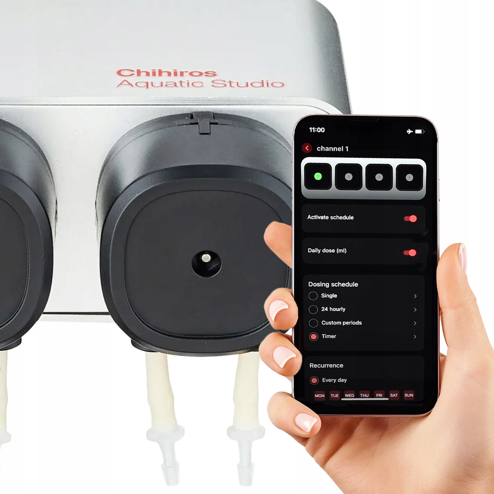 ➡️ Налаштування та керування дозаторними насосами здійснюється через програму My Chihiors, яка доступна як для мобільних пристроїв з операційною системою iOS, так і Android. Кожен насос програмується окремо, а також може бути запущений поза програмою за бажанням користувача.