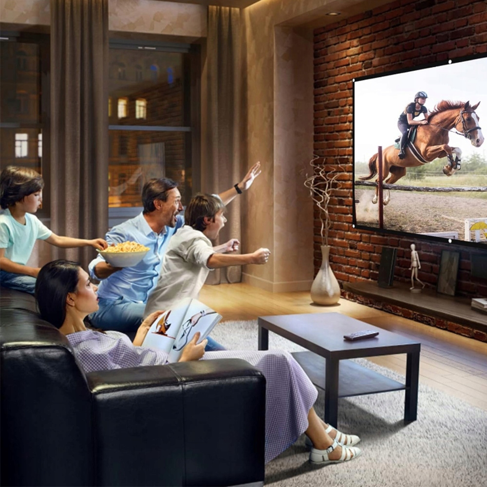 У цьому 120-дюймовому екрані проектора використовується матеріал із поліестерового волокна, який забезпечує чіткіші зображення, яскравіші кольори та відсутність кольорових відтінків у складеному або стиснутому стані. На екрані не буде плям, які могли б вплинути на візуальні враження, і він достатньо товстий, щоб ви не могли побачити, що за ним.