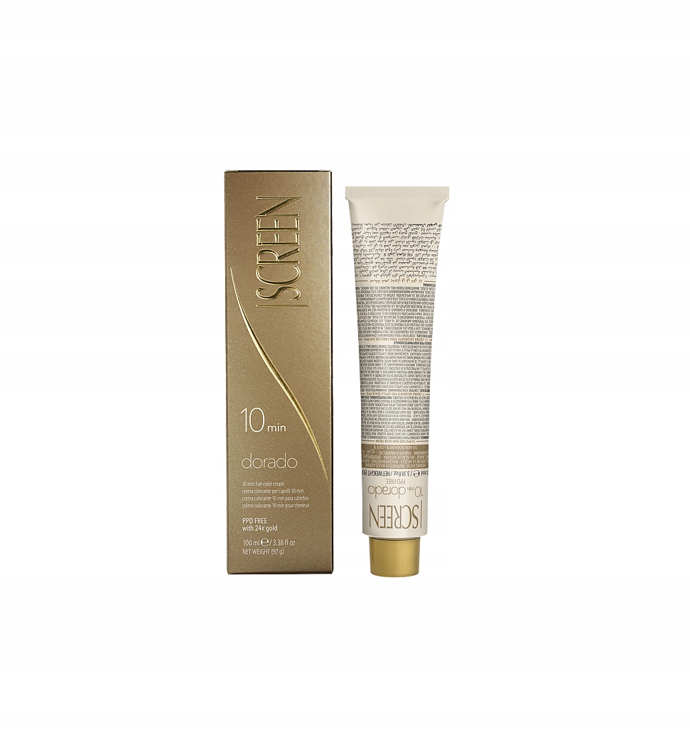 Постійне окислювальне фарбування SCREEN DORADO є головним героєм еволюції, яка створює нові можливості щодо кольорових послуг, які стають все більш інтелектуальними та швидкими, без шкоди для абсолютної якості, хроматичних і косметичних характеристик, які відрізняють його від інших. 10 MIN DORADO має ті ж властивості та особливості формули, що й Dorado. Він має характерну гелеподібну крем-формулу, також містить низький вміст аміаку, не містить PPD, парабенів і збагачений 24-каратним колоїдним золотом. Його технологія створення забезпечує під час підготовки формул кольорів ретельний відбір барвників, що характеризуються більшою реакційною здатністю, завдяки якій вони здатні окислюватися та проявлятися ВСЕГО ЗА 10 ХВИЛИН застосування.