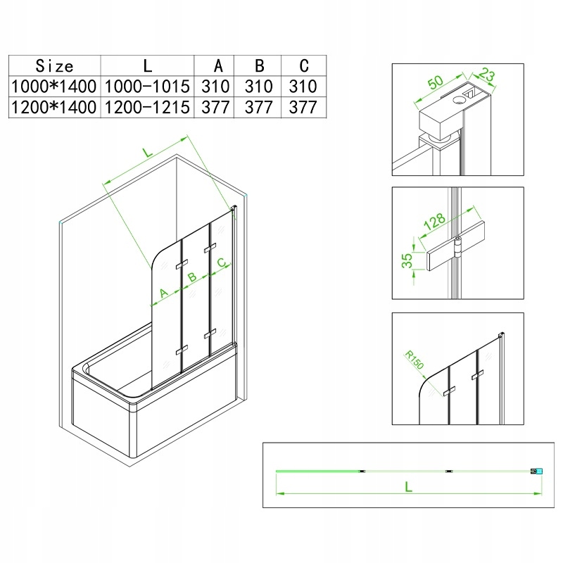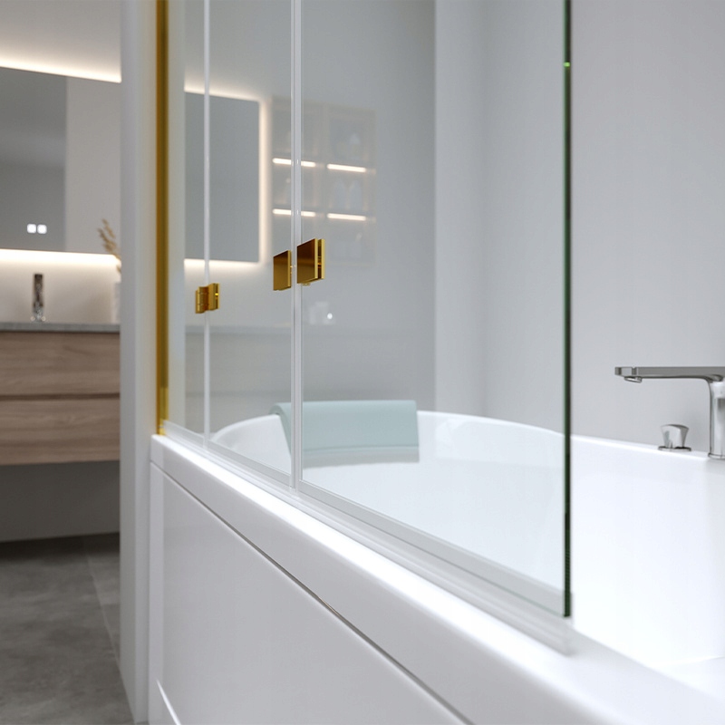 Екран з розмірами 100x140, який встановлений на краю ванни, є альтернативою традиційним душовим кабінам, поєднуючи переваги використання як ванни, так і душу. Цей екран - це не лише практичний елемент фурнітури для ванної, але й прекрасне прикраса сучасної ванної кімнати. Виготовлений з товстого, 6 мм загартованого скла та золотого профілю, забезпечує виняткову довговічність та легкість очищення.