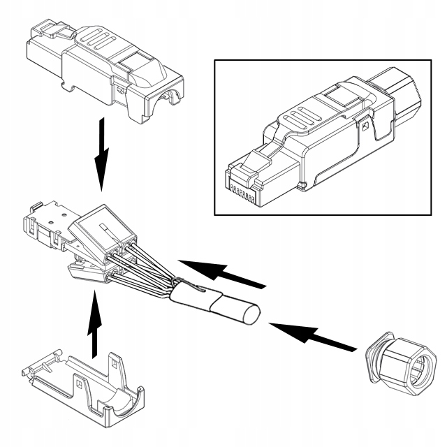 Вилка використовується для підключення до витої пари з проводами діаметром (жила з ізоляцією) 0,8 ~ 1,5 мм, тобто практично до будь-якої доступної на ринку. Оболонка, що входить у комплект, має циліндричний кінець із гайкою, що дозволяє підходити до кабелю товщиною 6–8 мм. Вилка призначена для кріплення проводів згідно Стандарт T568A або B, тобто найбільш часто використовуваний - прикріплена наклейка з описом з'єднань полегшує розташування провідників відповідно до стандарту T568B - зазвичай використовується в Польщі. Швидка збірка можлива без спеціальних інструментів - модуль затискається вручну або плоскогубцями, а зайві кабелі обрізаються кусачками.