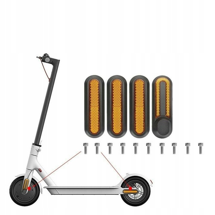 Набір практичних захисних щитів для передніх і задніх колісних болтів, призначений для скутерів Xiaomi. Елементи, виготовлені з міцного пластику, оснащені відбитками, що покращують видимість транспортного засобу після темряви.