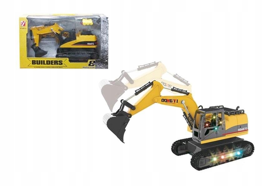 Пластиковий екскаватор. Іграшка рухається вперед і назад і повертається вправо і вліво. Крім того, іграшка світиться різнокольоровими вогнями і видає звуки. Іграшка працює від батарейок АА (не входять в комплект) і Ni-Cd батарейки (входять в комплект). Товар упакований в картонну коробку з прозорим вікном. Наведені розміри є розмірами упаковки. Іграшка для дітей від 6 років.