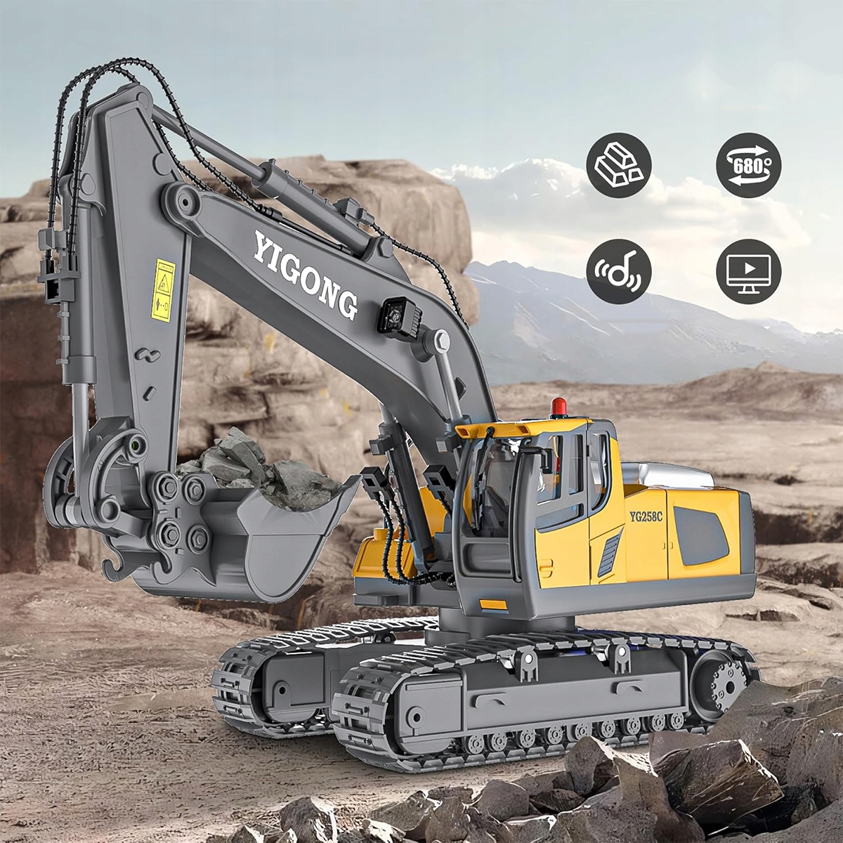 Цей радіоуправляний екскаватор у масштабі 1:20 створений, щоб надати дітям досвід симуляції роботи, і має платформу керування, металевий ковш, важіль екскаватора, гусениці, реалістичні звуки та миготливі вогні. Візьміть на себе роль водія екскаватора та керуйте цією великою вантажівкою!