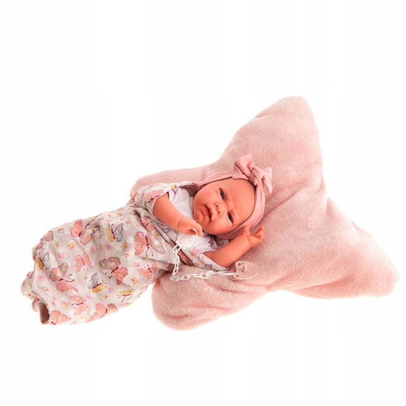 Дівчинка, що сміється, була гарно одягнена. У Леа біле боді, виготовлене з органічного матеріалу. Іспанський бренд, йдучи в ногу з прогресом, подбав про те, щоб кожен комплект одягу був виготовлений з екологічного матеріалу, безпечного та довговічного у використанні. М'яка подушечка та спальний мішок, прикрашений візерунком метелика, дозволять зручно розташувати ляльку, і кожна дівчинка із задоволенням буде разом подрімати.