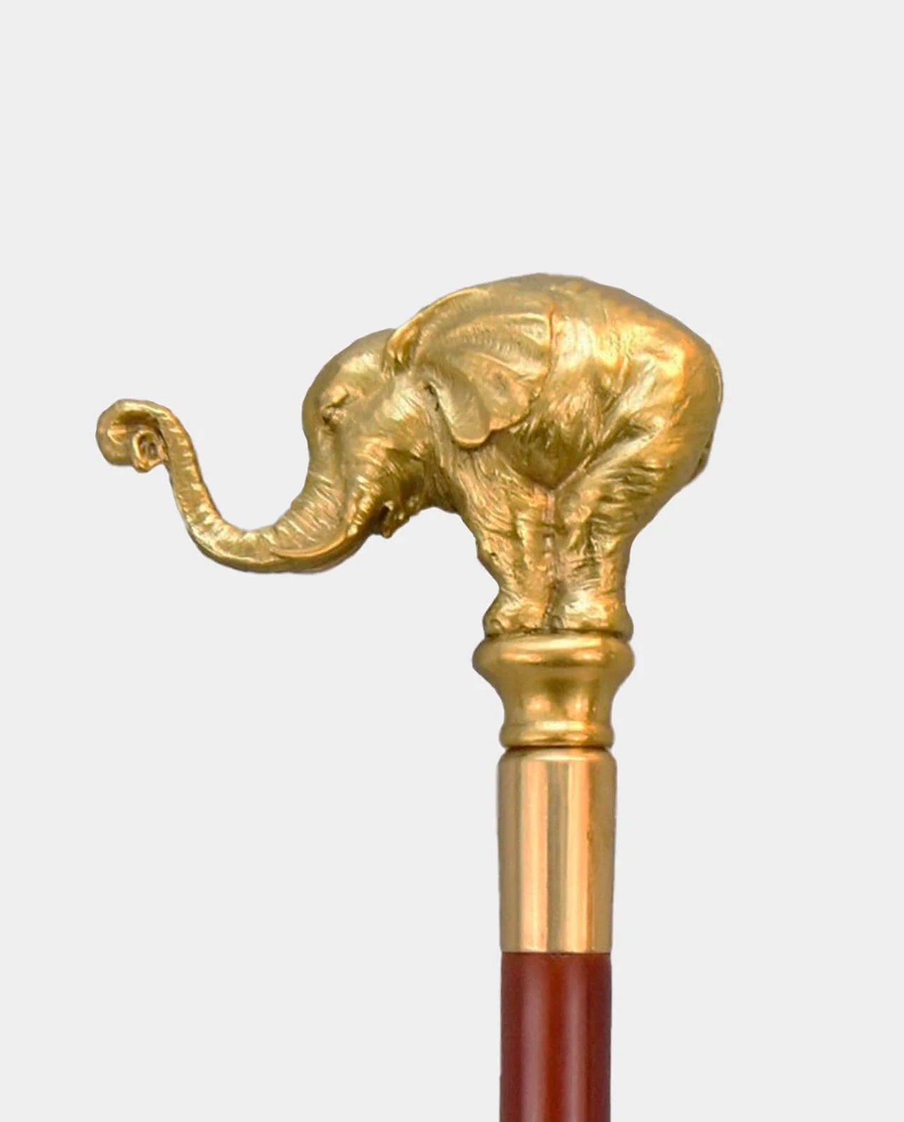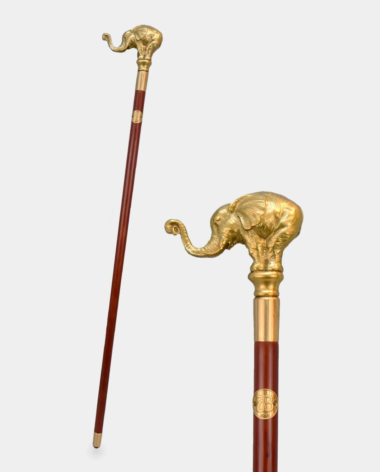 Ексклюзивна палиця з ручкою у вигляді фігурки слона з піднятим хоботом. Ця красива та оригінальна палиця виготовлена з високоякісних матеріалів - бронзи та дерева. Стрижень палиці виготовлений з міцної деревини бука, покритий елегантним вишневим лаком і оброблений гумовою ніжкою. Ручка у формі декоративної скульптури виготовлена з бронзи.