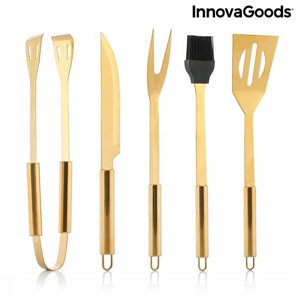 Повний, високоякісний та елегантний набір для барбекю, який завдяки своєму розкішному та ексклюзивному зовнішньому вигляду ідеально підходить як подарунок. Набір надзвичайно міцний і міцний, включає чорний футляр з оксфордської тканини та 5 позолочених предметів посуду з нержавіючої сталі: шпатель, щипці, пензлик, виделку та ніж. Посуд оснащений неслизькими ручками та гачком для підвішування при необхідності. Чохол має застібку-блискавку, регульовані ремені для кріплення аксесуарів і 2 ручки для зручного перенесення у вигляді невеликої валізи.