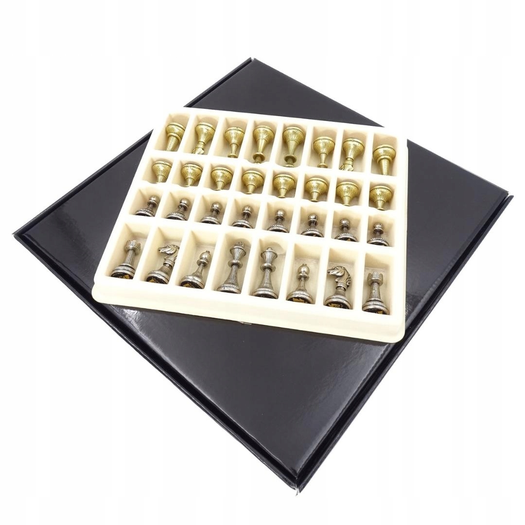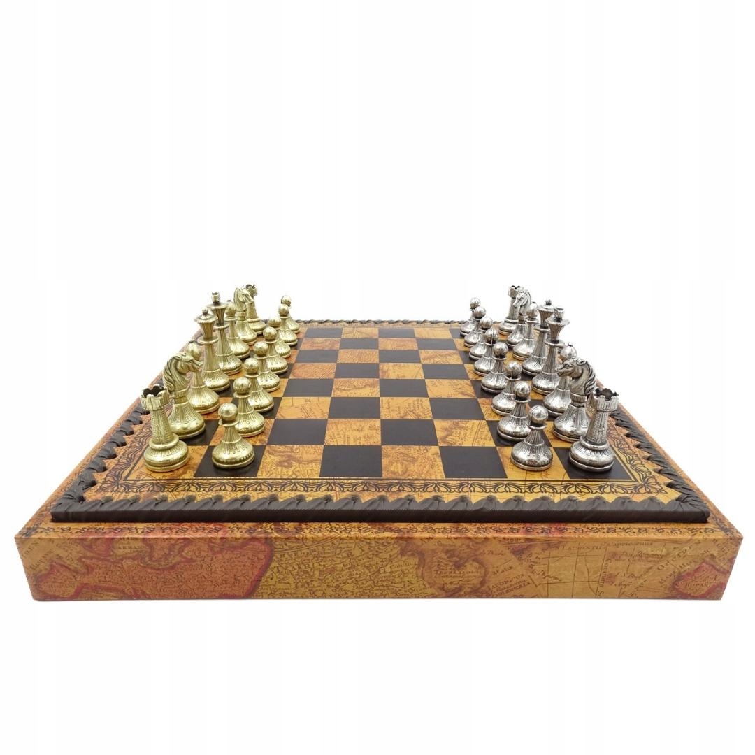 Ексклюзивні шахи виробництва італійської компанії Italfama, яка вже багато років спеціалізується на виробництві найякісніших шахів. Кожна фігура була виготовлена з точністю та дбайливістю з металу, а шахівниця – з матеріалу, що імітує шкіру. Елегантний позачасовий дизайн робить ці шахові фігури ідеальними як подарунок для любителів шахів або як елегантну прикрасу старовинних кімнат. Шахівниця, схожа на стару карту, надає цим шахам унікальний характер і неодмінно приверне увагу кожного, хто бачить їх уперше.