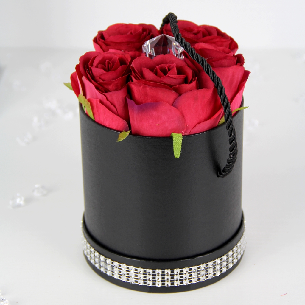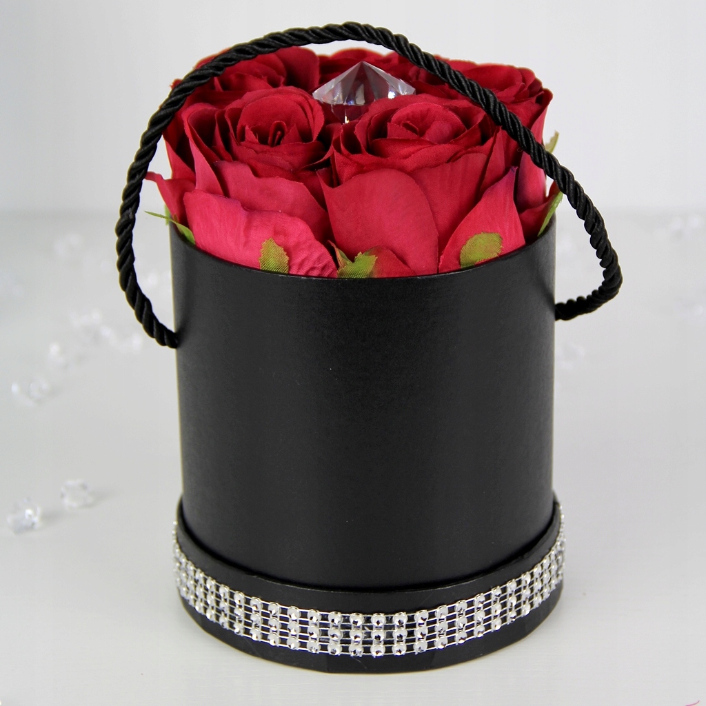 Ексклюзивний букет у FlowerBOX - ЧОРНИЙ зі сріблястими блискітками з 5x червоними ТРОЯНДАМИ преміум-класу з тканини - вони виглядають як ЖИТТЯ!