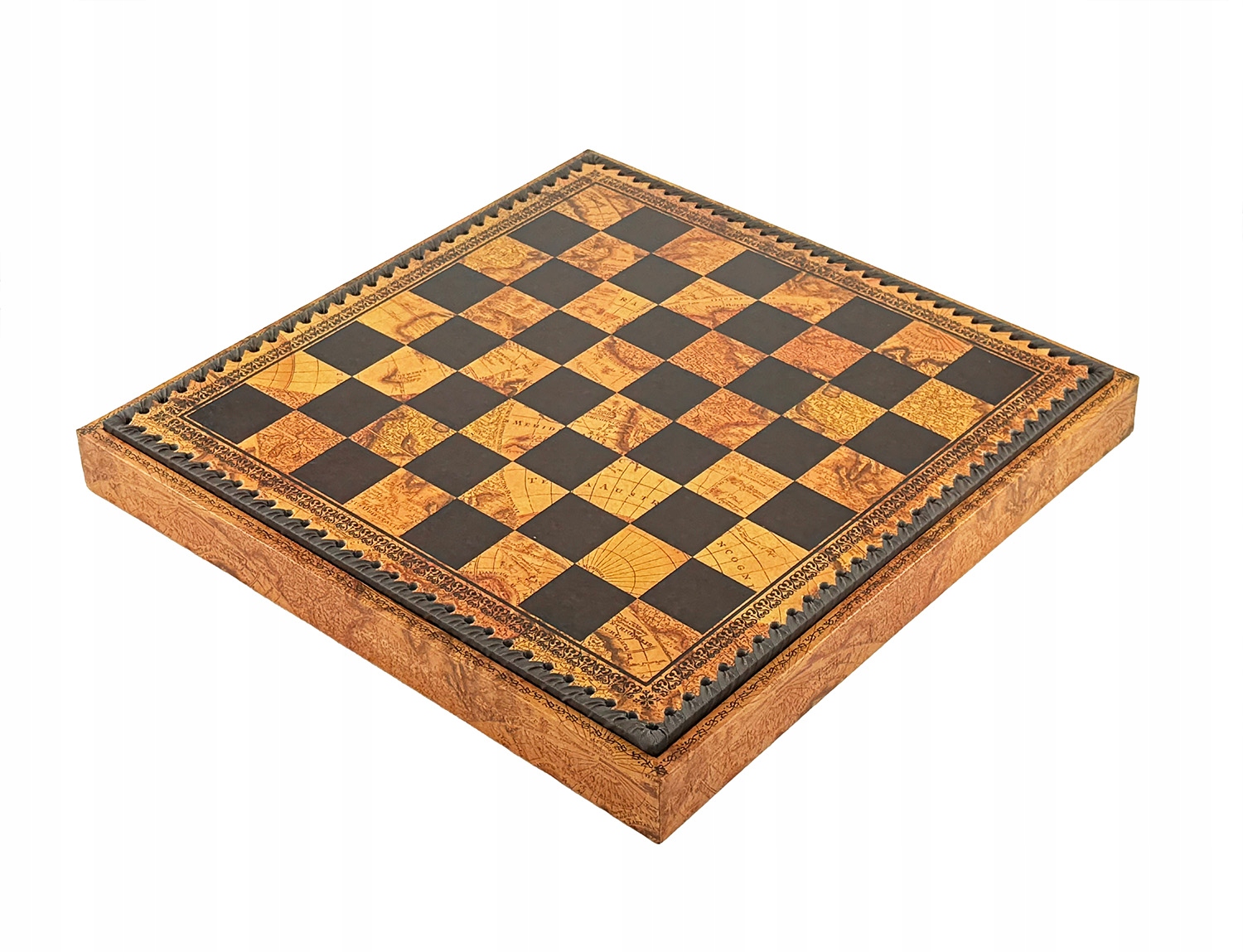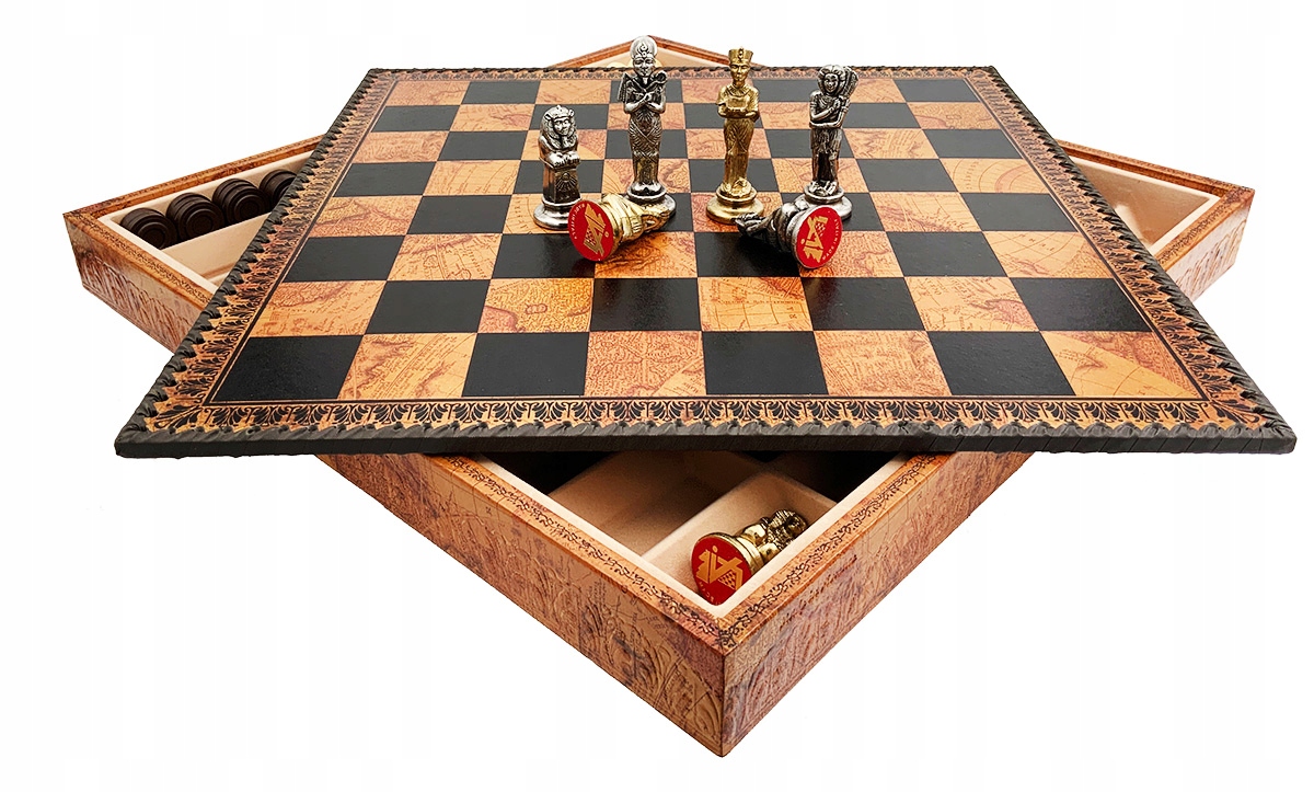 Шкіряна дошка - елегантна, міцна, приємна на дотик Металеві статуетки в стилі фараонів, сфінксів і обелісків Дві армії: золота і срібна з антикварною обробкою Декоративні рамки з єгипетськими орнаментами Компактне закриття - ідеальне для зберігання