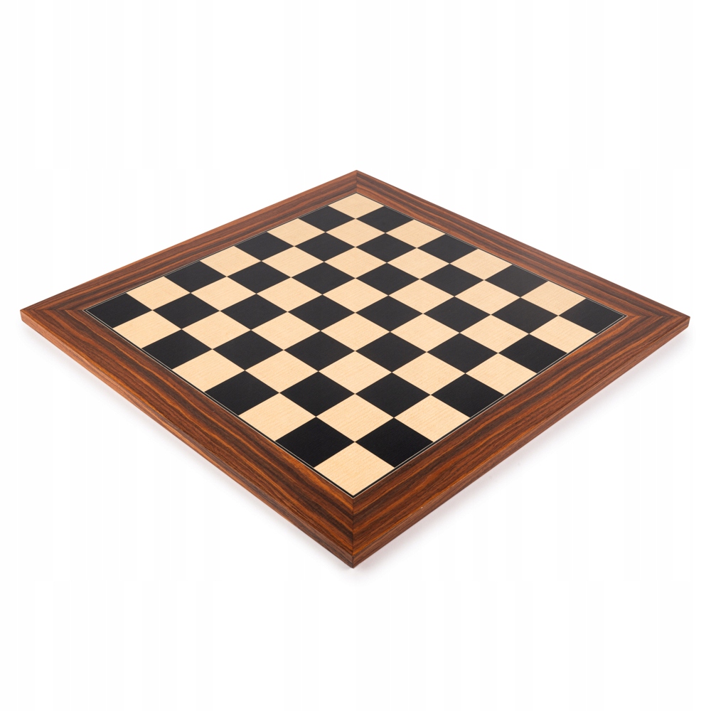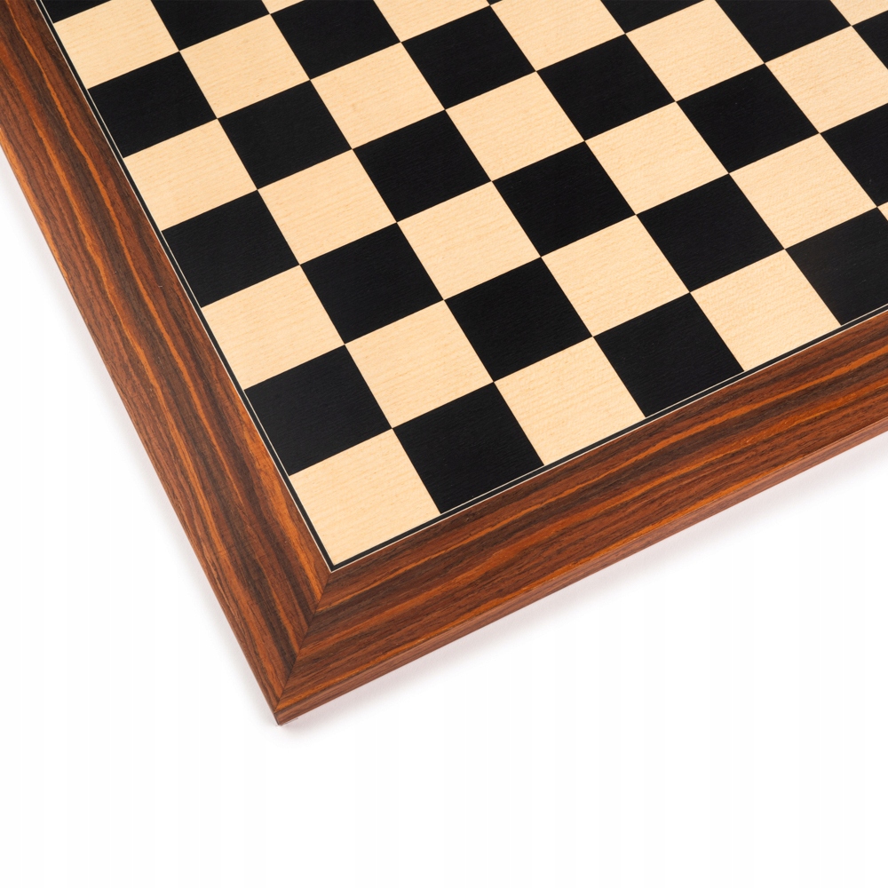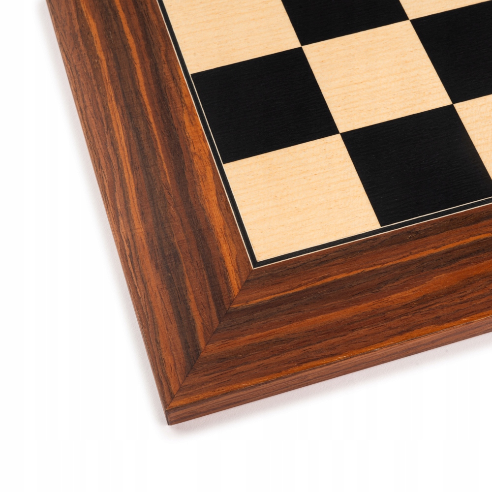 Розміри: 40 × 40 см Розмір поля: 4 см Товщина дошки: 1,3 см Темні поля: дерево чорного тюльпана Світлі поля: клен Каркас: екзотичне палісандр Сантос Покриття: матовий лак