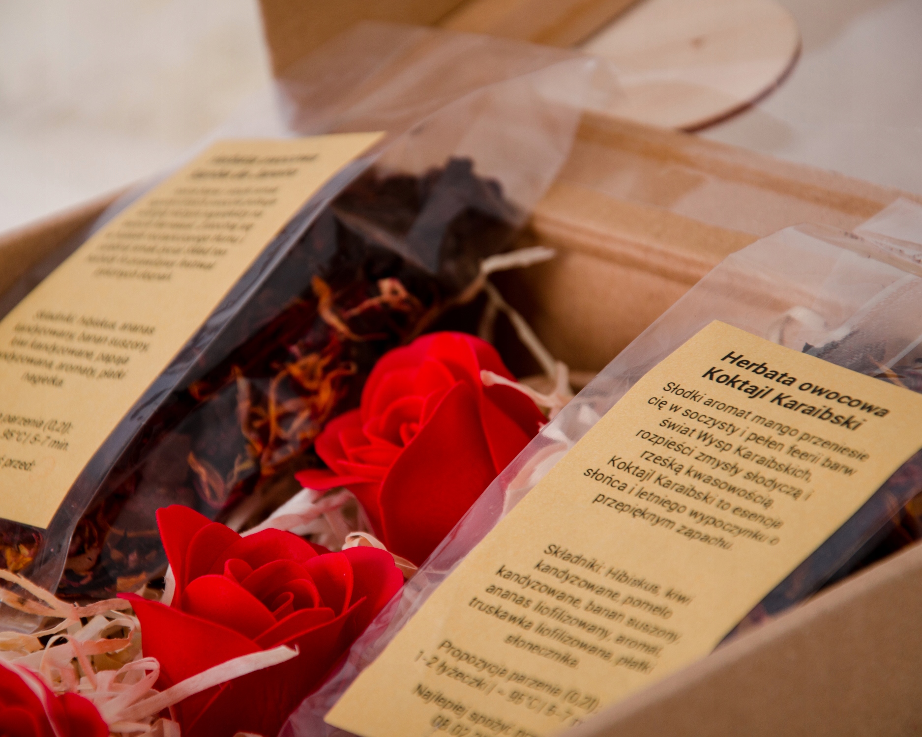 В коробці 2 чаю та мильні троянди. У верхній частині коробки є бант і вигравірувана табличка з побажаннями.